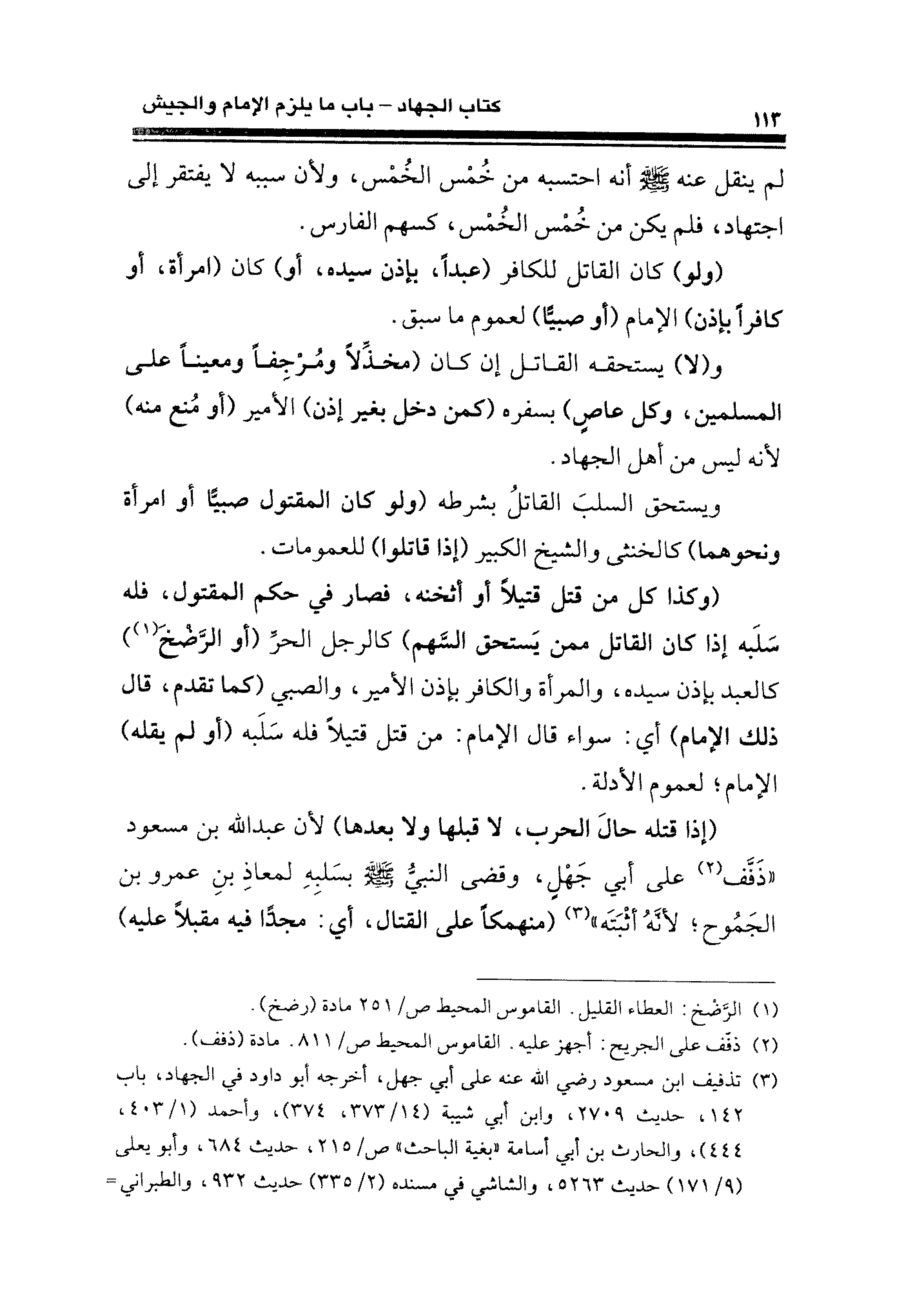 (إذا قتله حالَ الحرب، لا قبلها ولا بعدها) لأن عبد الله بن مسعود "ذَفَّف (¬٢) على أبي جَهْلٍ، وقضى النبىُّ - صلى الله عليه وسلم - بسَلبهِ لمعاذِ بنِ عمرو بن الجَمُوح؛ لأنَّهُ أثبَتَه" (¬٣) (منهمكًا على القتال، أي: مجدًّا فيه مقبلًا عليه)