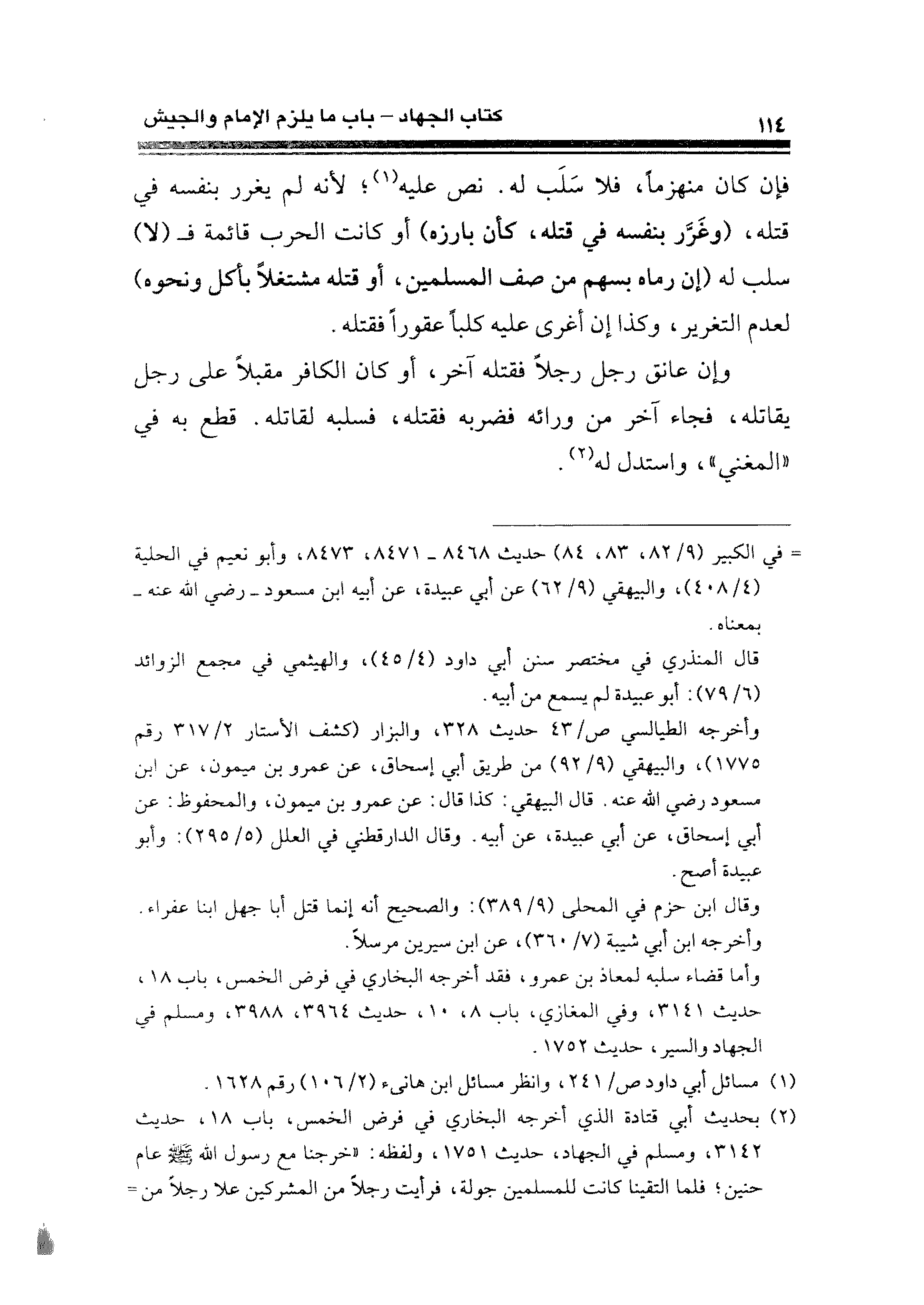 (¬٢) بحديث أبي قتادة الذي أخرجه البخاري في فرض الخمس، باب ١٨، حديث ٣١٤٢، ومسلم في الجهاد، حديث ١٧٥١، ولفظه: "خرجنا مع رسول الله - صلى الله عليه وسلم - عام حنين؛ فلما التقينا كانت للمسلمين جولة، فرأيت رجلًا من المشركين علا رجلًا من =