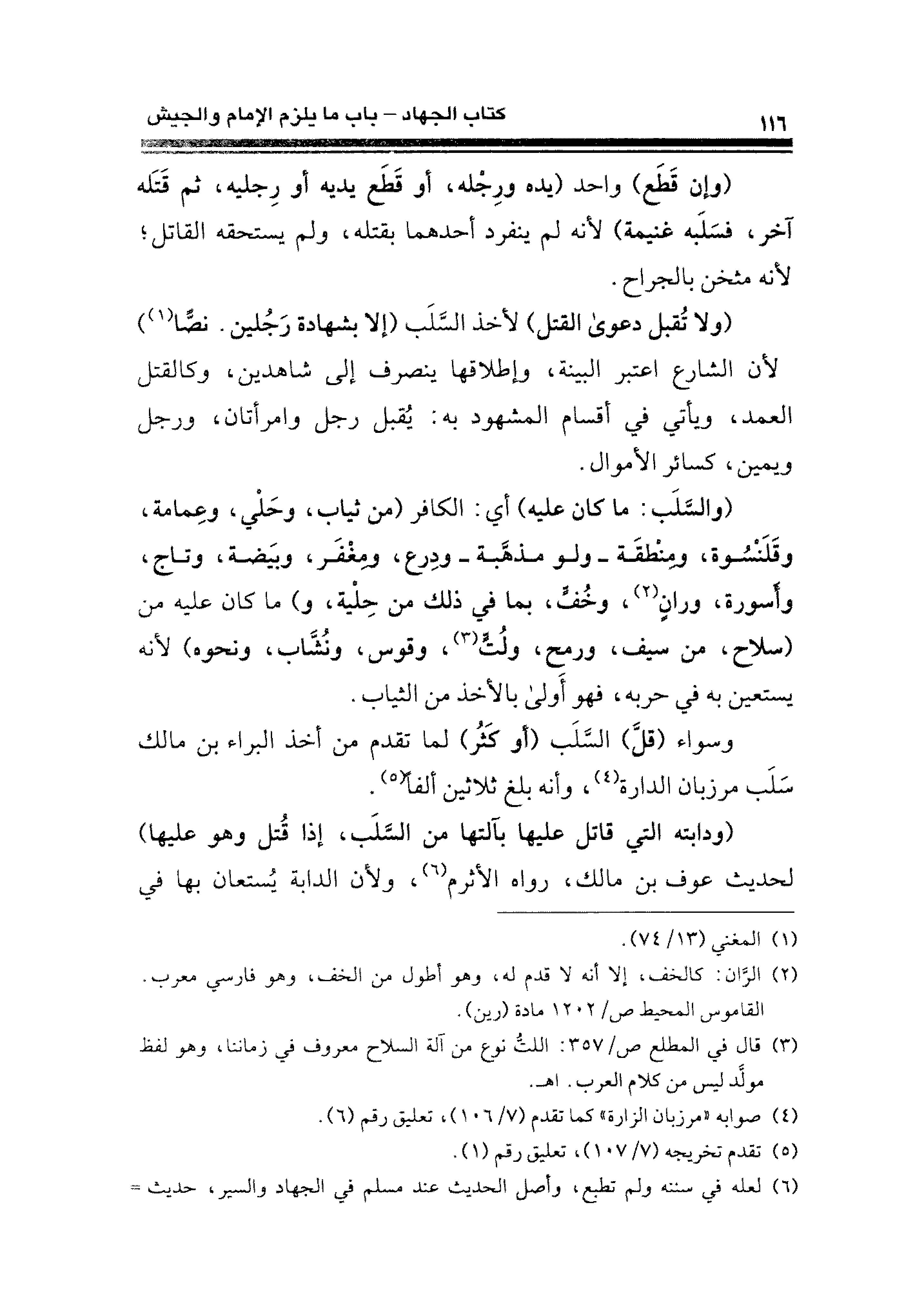 (والسَّلَب: ما كان عليه) أي: الكافر (من ثياب، وحَلْي، وعِمامة، وقَلَنْسُوة، ومِنْطقَة -ولو مذهَّبة- ودِرع، ومِغْفَر، وبيَضة، وتاج، وأَسورة، ورانٍ (¬٢)، وخُفٍّ، بما في ذلك من حِلْية، و) ما كان عليه من (سلاح، عن سيف، ورمح، ولُتٍّ (¬٣)، وقوس، ونُشَّاب، ونحوه) لأنه يستعين به في حربه، فهو أَولى بالأخذ من الثياب.