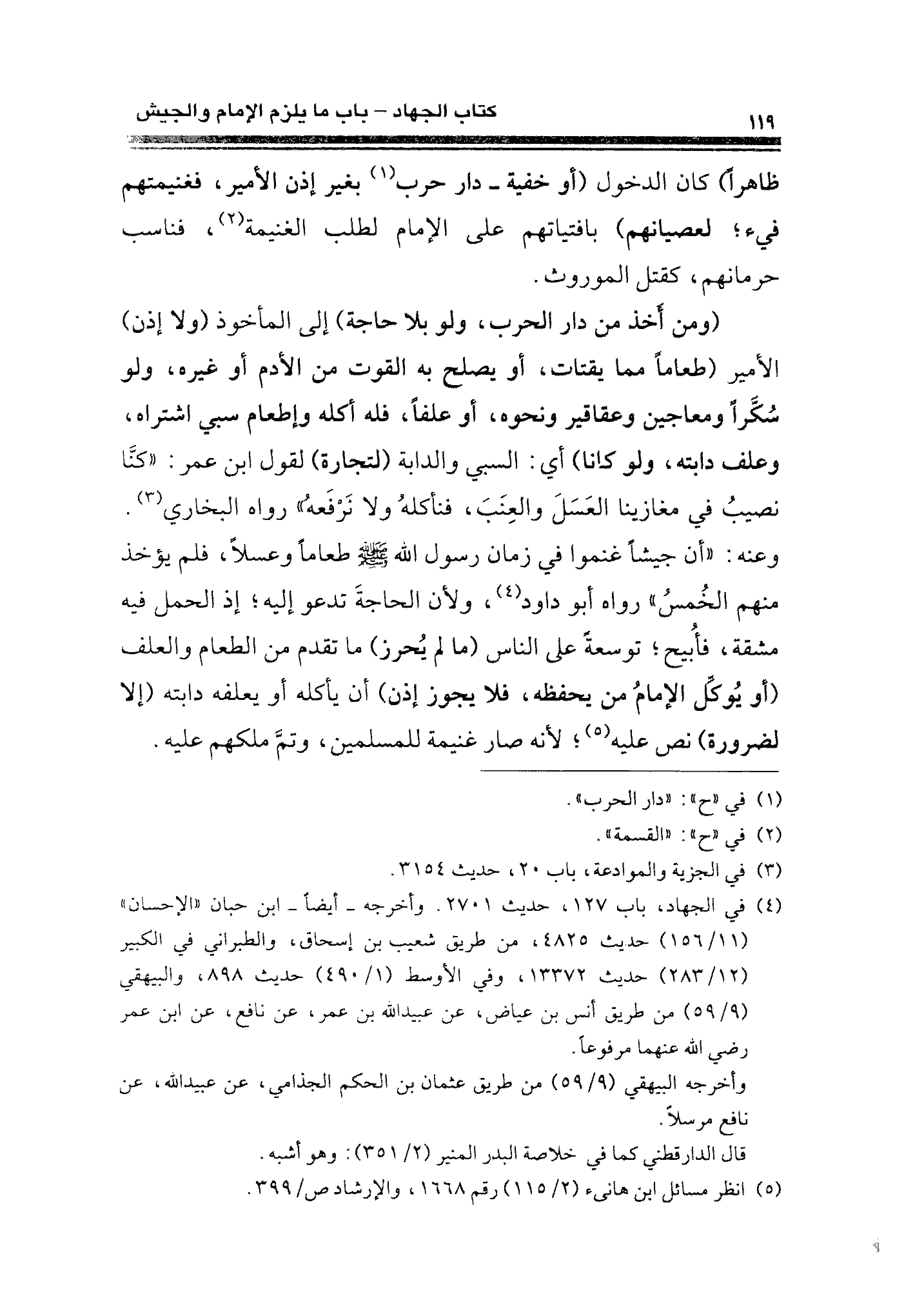 (ومن أخذ من دار الحرب، لو بلا حاجة) إلى المأخوذ (ولا إذن) الأمير (طعامًا مما يقتات، أو يصلح به القوت من الأدم أو غيره، ولو سُكَّرًا ومعاجين وعقاقير ونحوه، أو علفًا، فله أكله وإطعام سبي اشتراه، وعلف دابته، ولو كانا) أي: السبي والدابة (لتجارة) لقول ابن عمر: "كنَّا نصيبُ في مغازينا العَسَلَ والعِنَبَ، فنأكلهُ ولا نَرْفَعهُ" رواه البخاري (¬٣). وعنه: "أن جيشًا غنموا في زمان رسول الله - صلى الله عليه وسلم - طعامًا وعسلًا، فلم يؤخذ منهم الخُمسُ" رواه أبو داود (¬٤)، ولأن الحاجةَ تدعو إليه، إذ الحمل فيه مشقة، فأُبيح، توسعةً على الناس (ما لم يُحرز) ما تقدم من الطعام والعلف (أو يُوكِّل الإمامُ من يحفظه، فلا يجوز إذن) أن يأكله أو يعلفه دابته (إلا لضرورة) نص عليه (¬٥)؛ لأنه صار غنيمة للمسلمين، وتمَّ ملكهم عليه.