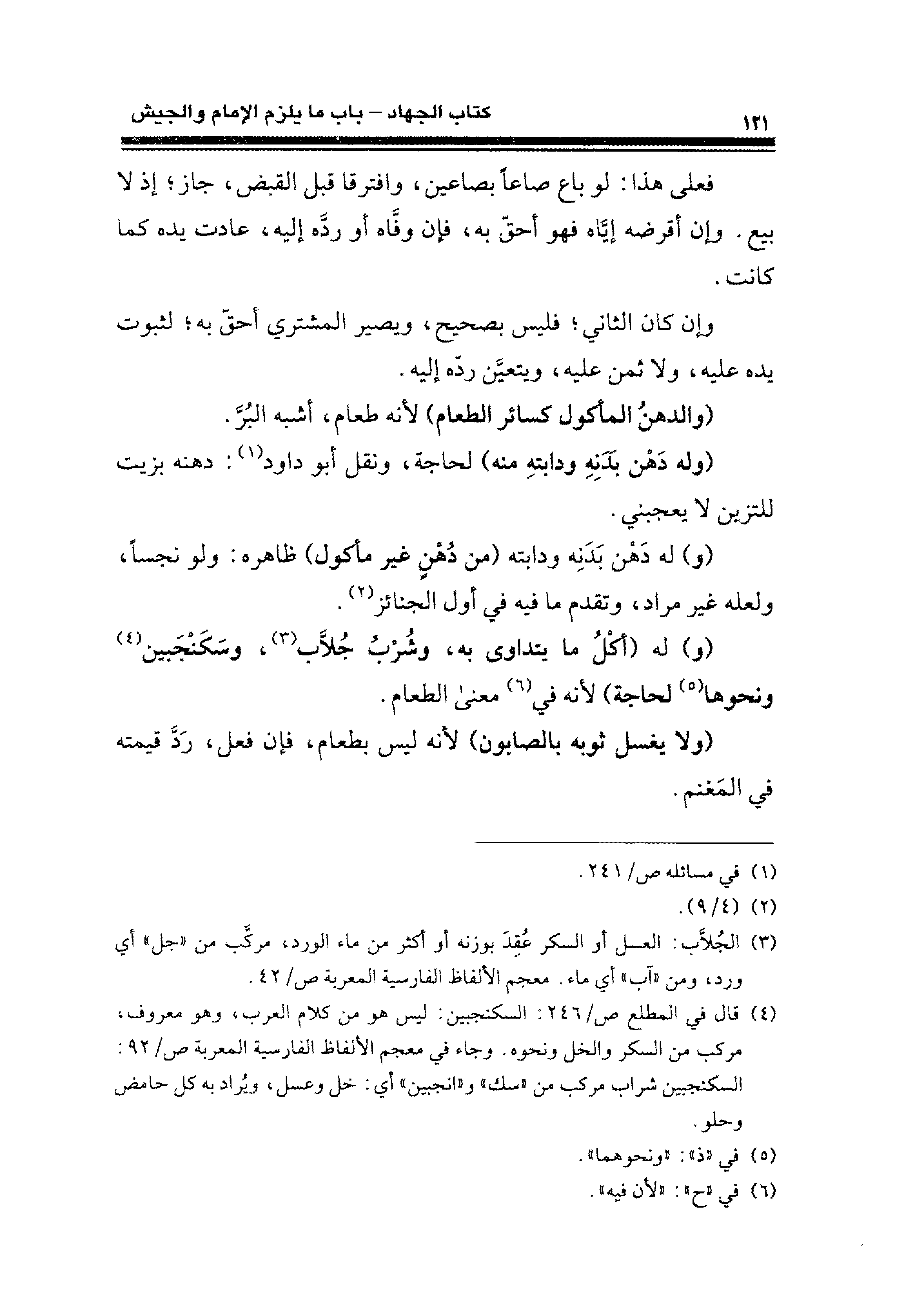 (¬٤) قال في المطلع ص/ ٢٤٦: السكنجبين: ليس هو من كلام العرب، وهو معروف، مركب من السكر والخل ونحوه. وجاء في معجم الألفاظ الفارسية المعربة ص/ ٩٢: السكنجبين شراب مركب من "سك" و"انجبين" أي: خل وعسل، ويُراد به كل حامض وحلو.