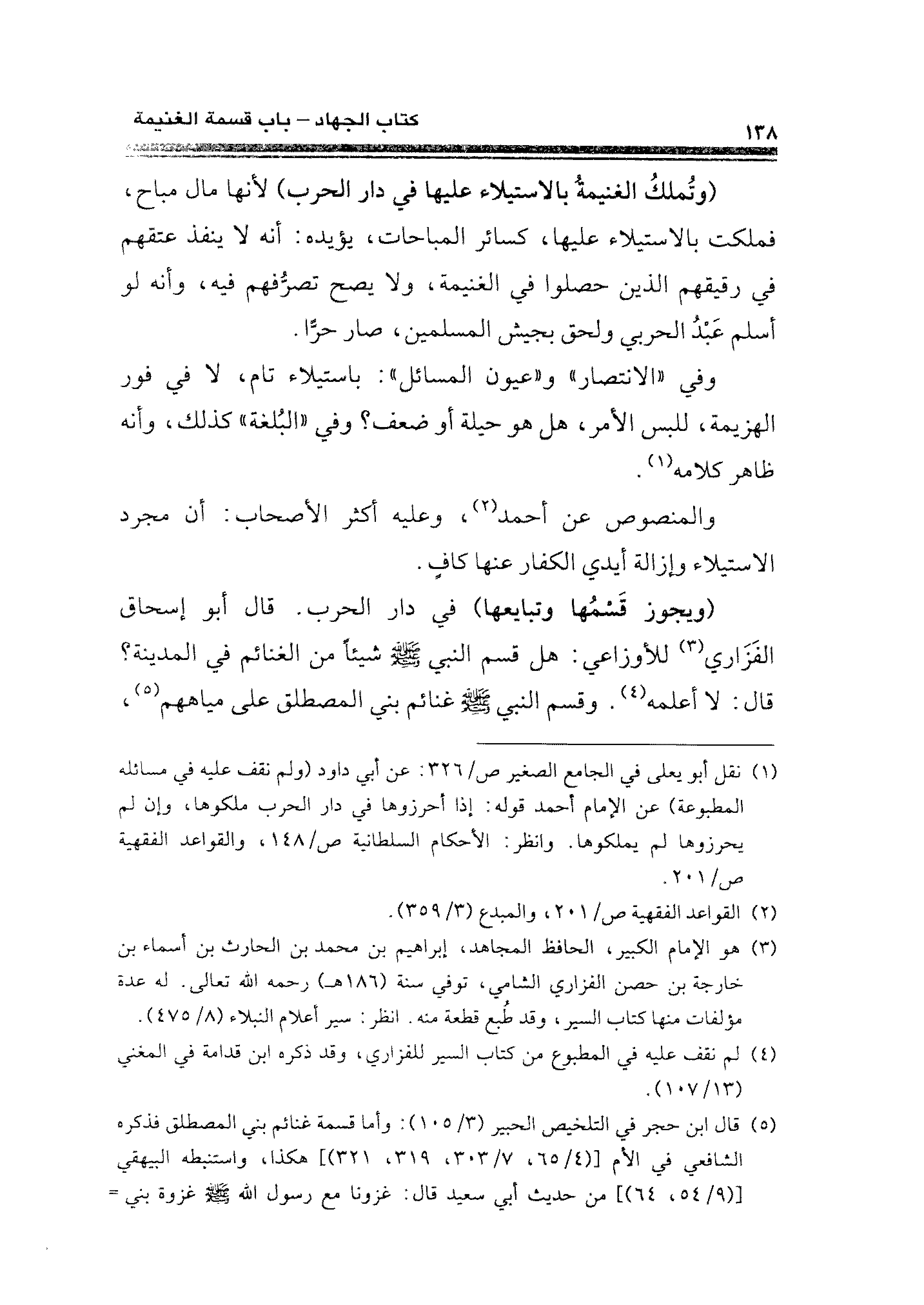 (¬١) نقل أبو يعلى في الجامع الصغير ص/ ٣٢٦: عن أبي داود (ولم نقف عليه في مسائله المطبوعة) عن الإمام أحمد قوله: إذا أحرزوها في دار الحرب ملكوها، وإن لم يحرزوها لم يملكوها. وانظر: الأحكام السلطانية ص/ ١٤٨، والقواعد الفقهية ص / ٢٠١.
