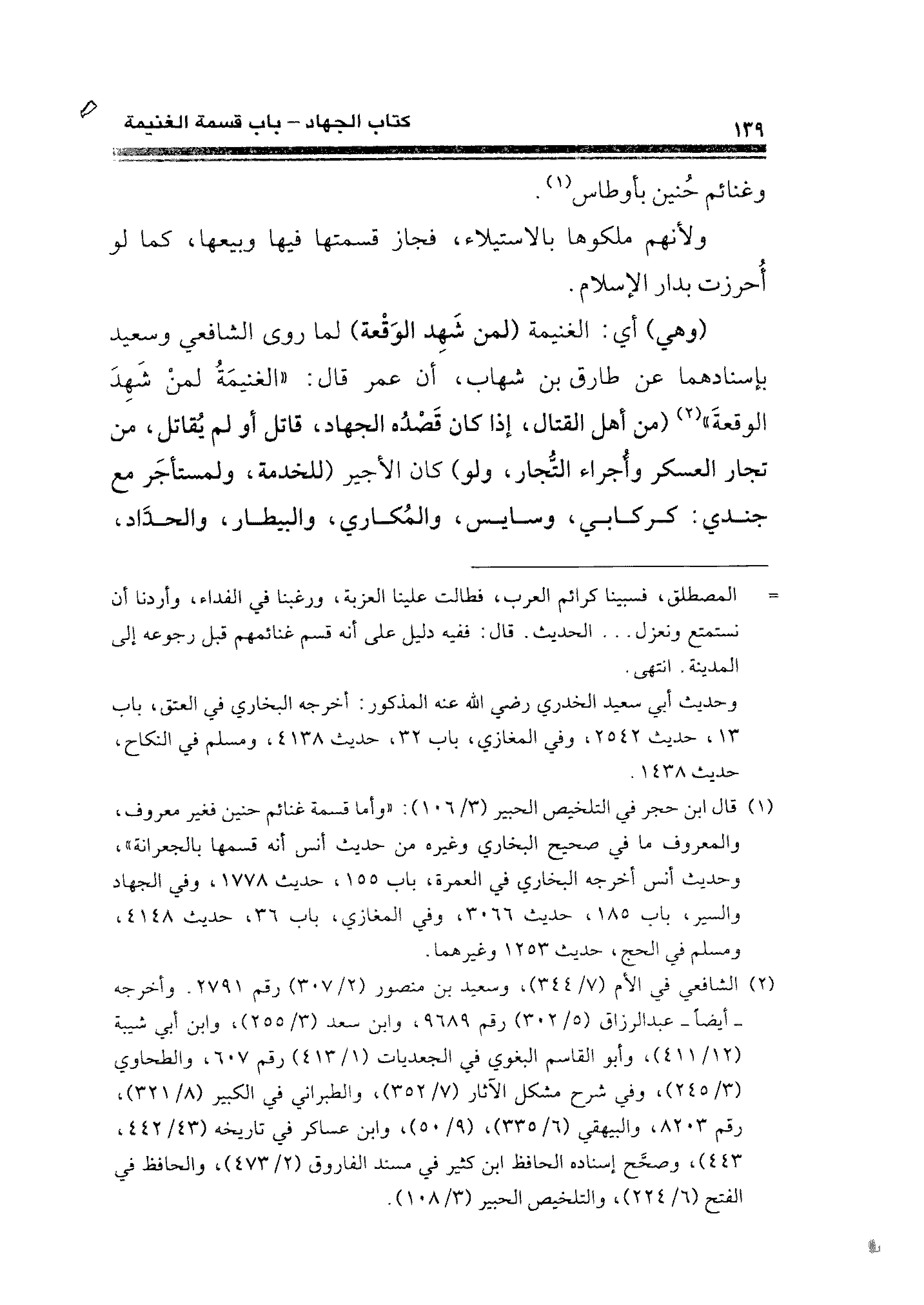 (¬١) قال ابن حجر في التلخيص الحبير (٣/ ١٠٦): "وأما قسمة غنائم حنين فغير معروف، والمعروف ما في صحيح البخاري وغيره من حديث أنس أنه قسمها بالجعرانة"، وحديث أنس أخرجه البخاري في العمرة، باب ١٥٥، حديث ١٧٧٨، وفي الجهاد والسير، باب ١٨٥، حديث ٣٠٦٦، وفي المغازي، باب ٣٦، حديث ٤١٤٨، ومسلم في الحج، حديث ١٢٥٣ وغيرهما.