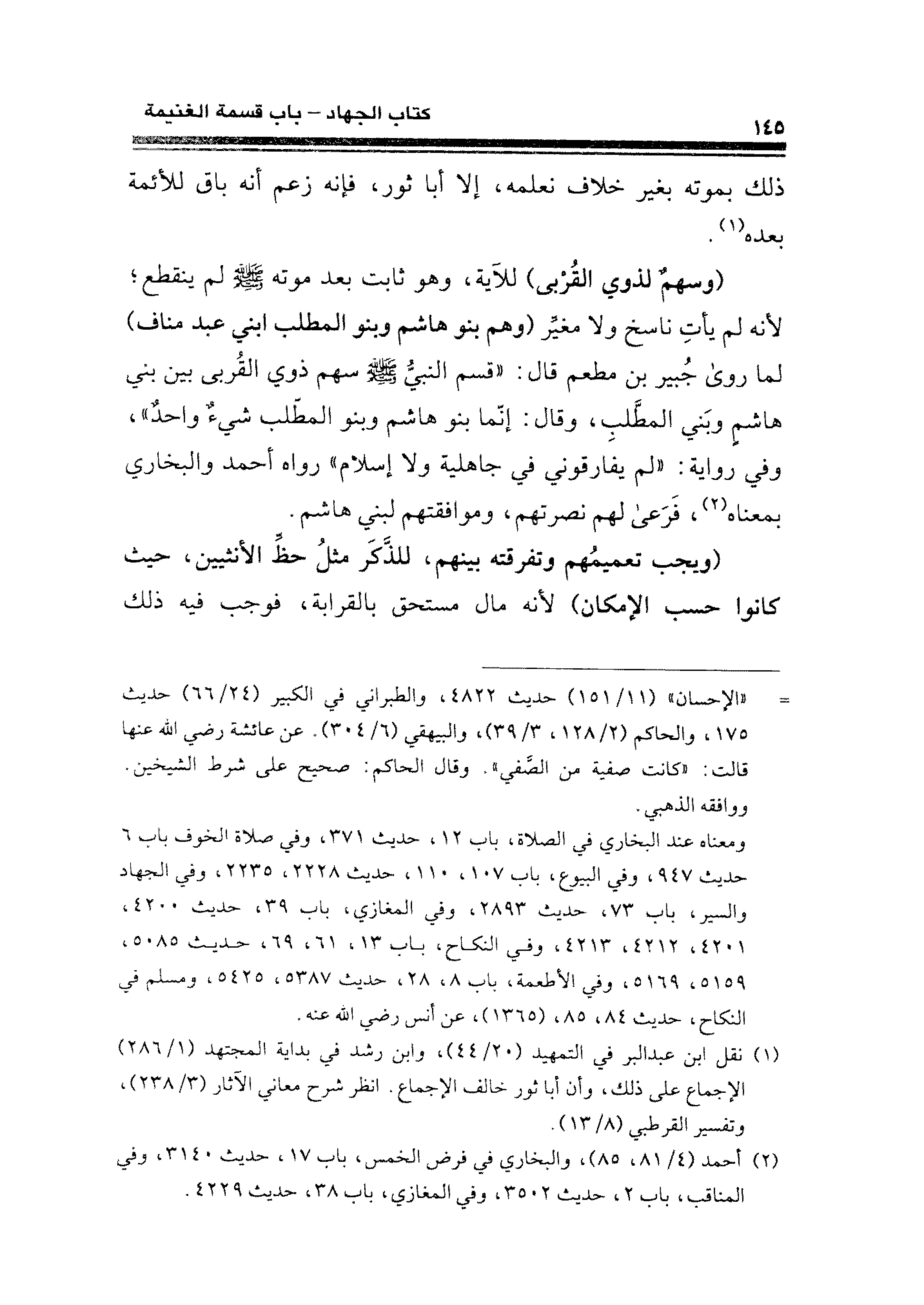 (وسهمٌ لذوي القُرْبى) للآية، وهو ثابت بعد موته - صلى الله عليه وسلم - لم ينقطع؛ لأنه لم يأتِ ناسخ ولا مغيِّر (وهم بنو هاشم وبنو المطلب ابني عبد مناف) لما روى جُبير بن مطعم قال: "قسم النبيُّ - صلى الله عليه وسلم - سهم ذوي القُربى بين بني هاشمٍ وبَني المطَّلبِ، وقال: إنّما بنو هاشم وبنو المطّلب شيءٌ واحدٌ"، وفي رواية: "لم يفارقوني في جاهلية ولا إسلام" رواه أحمد والبخاري بمعناه (¬٢)، فَرَعى لهم نصرتهم، وموافقتهم لبني هاشم.