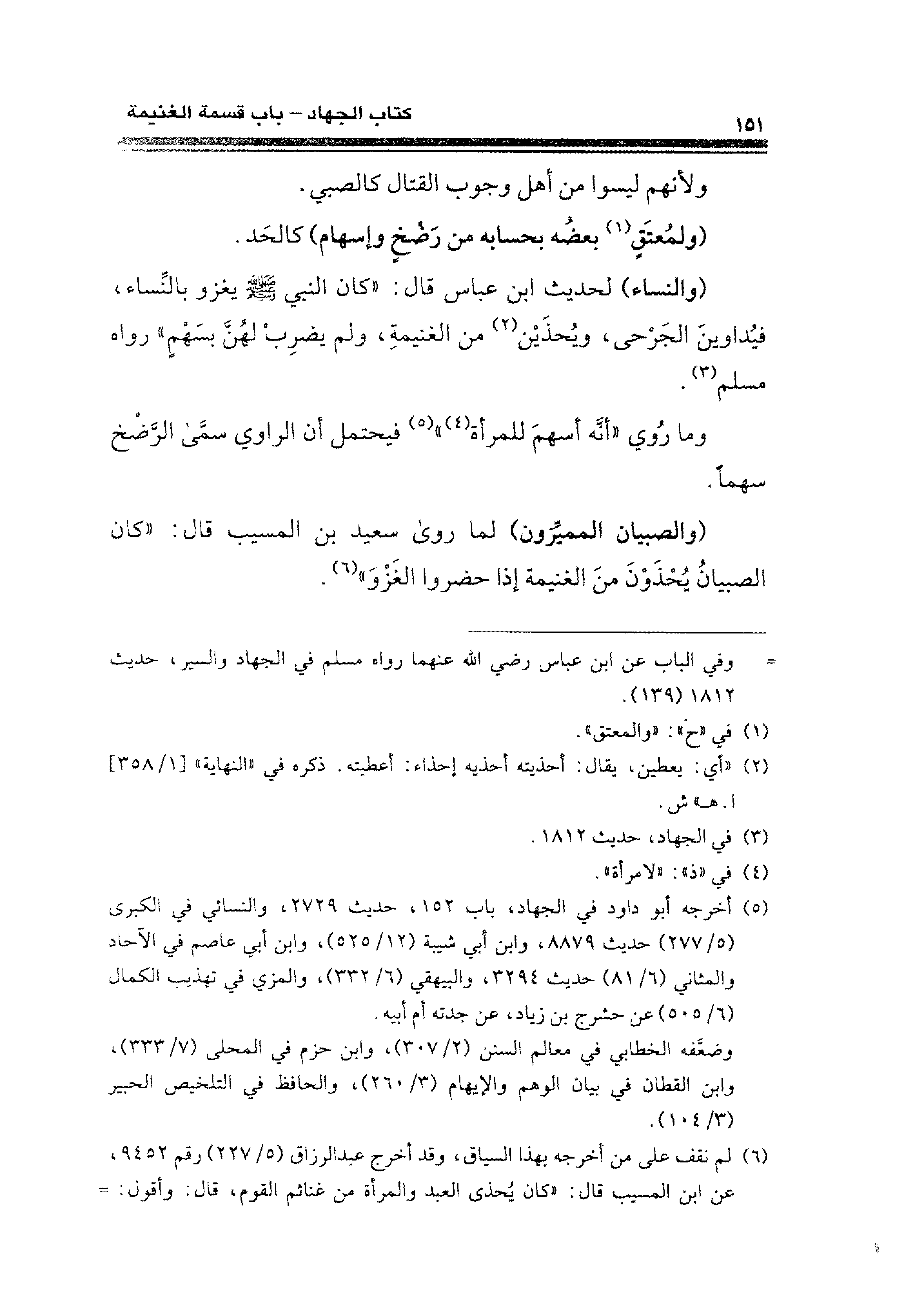 (¬٦) لم نقف على من أخرجه بهذا السياق، وقد أخرج عبد الرزاق (٥/ ٢٢٧) رقم ٩٤٥٢، عن ابن المسيب قال: "كان يُحذى العبد والمرأة من غنائم القوم، قال: وأقول: =