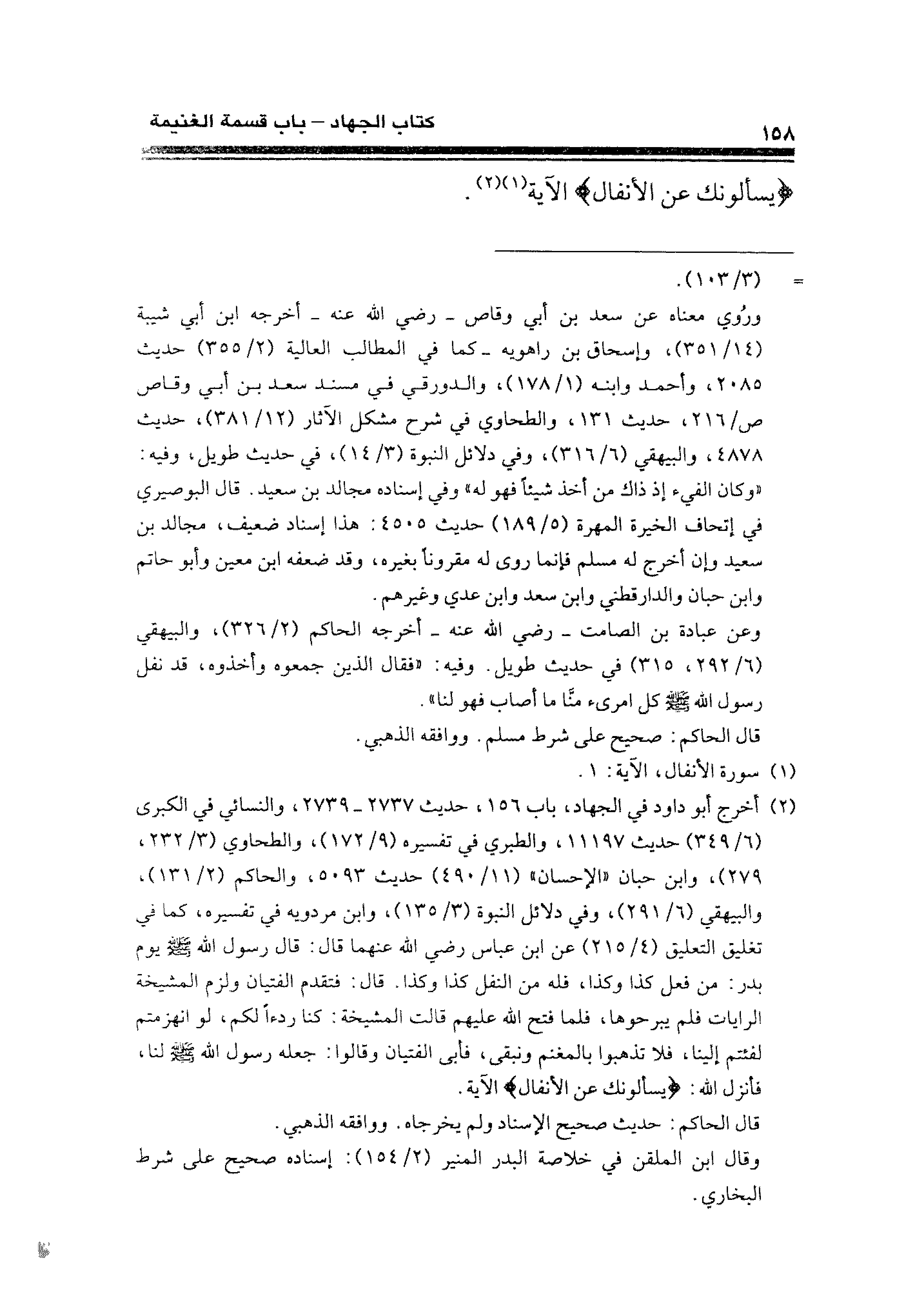 (¬٢) أخرج أبو داود في الجهاد، باب ١٥٦، حديث ٢٧٣٧ - ٢٧٣٩، والنسائي في الكبرى (٦/ ٣٤٩) حديث ١١١٩٧، والطبري في تفسيره (٩/ ١٧٢)، والطحاوي (٣/ ٢٣٢، ٢٧٩)، وابن حبان "الإحسان" (١١/ ٤٩٠) حديث ٥٠٩٣، والحاكم (٢/ ١٣١)، والبيهقي (٦/ ٢٩١)، وفي دلائل النبوة (٣/ ١٣٥)، وابن مردويه في تفسيره، كما في تغليق التعليق (٤/ ٢١٥) عن ابن عباس رضي الله عنهما قال: قال رسول الله - صلى الله عليه وسلم - يوم بدر: من فعل كذا وكذا، فله من النفل كذا وكذا. قال: فتقدم الفتيان ولزم المشيخة الرايات فلم يبرحوها، فلما فتح الله عليهم قالت المشيخة: كنا ردءًا لكم، لو انهزمتم لفئتم إلينا، فلا تذهبوا بالمغنم ونبقى، فأبى الفتيان وقالوا: جعله رسول الله - صلى الله عليه وسلم - لنا، فأنزل الله: {ويسألونك عن الأنفال} الآية.