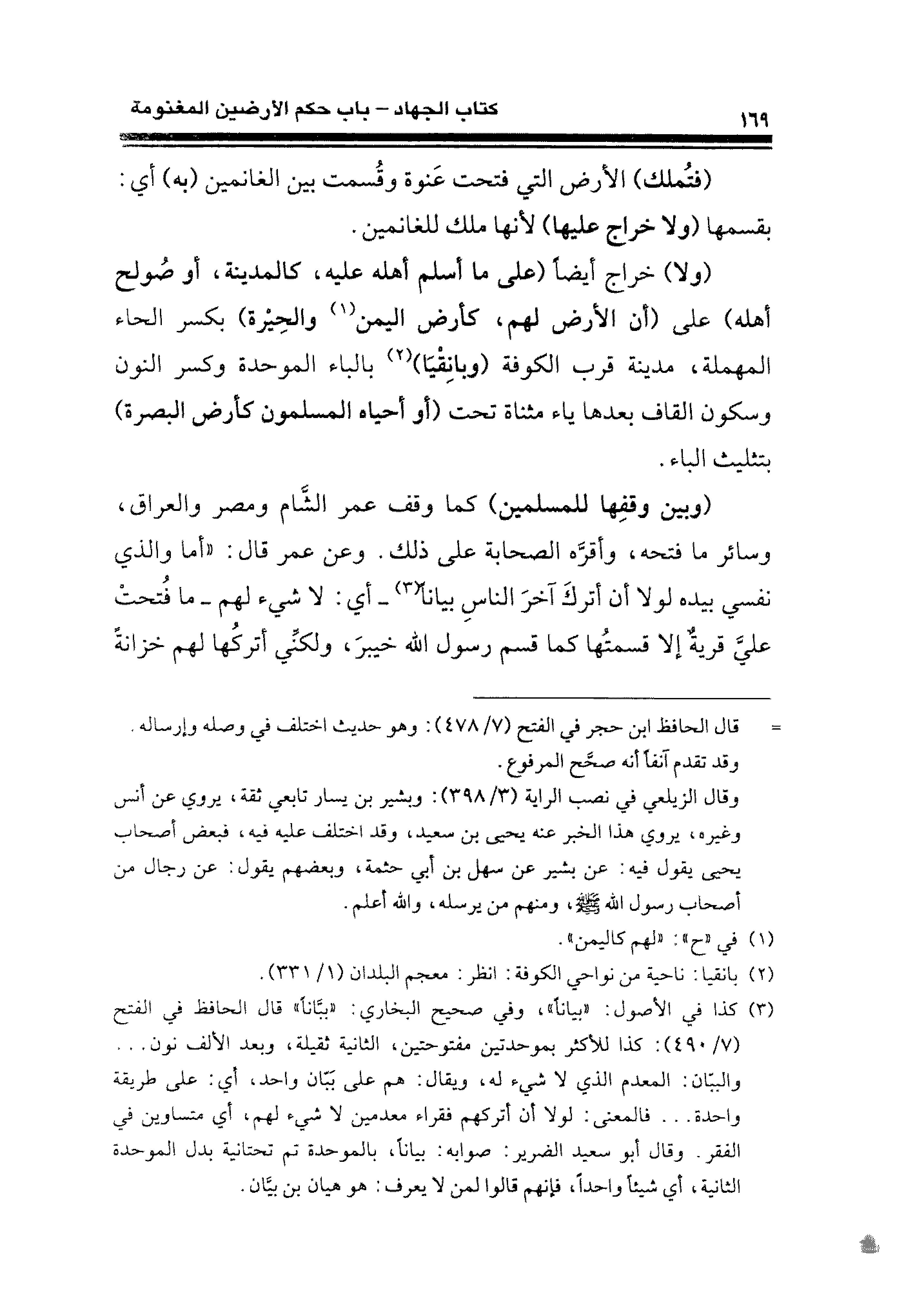(وبين وقفِها للمسلمين) كما وقف عمر الشَّام ومصر والعراق، وسائر ما فتحه، وأقرَّه الصحابة على ذلك. وعن عمر قال: "أما والذي نفسي بيده لولا أن أتركَ آخرَ الناسِ بيانًا (¬٣) -أي: لا شيء لهم- ما فُتحتْ عليَّ قريةٌ إلا قسمتُها كما قسم رسول الله خيبرَ، ولكني أتركها لهم خزانةً