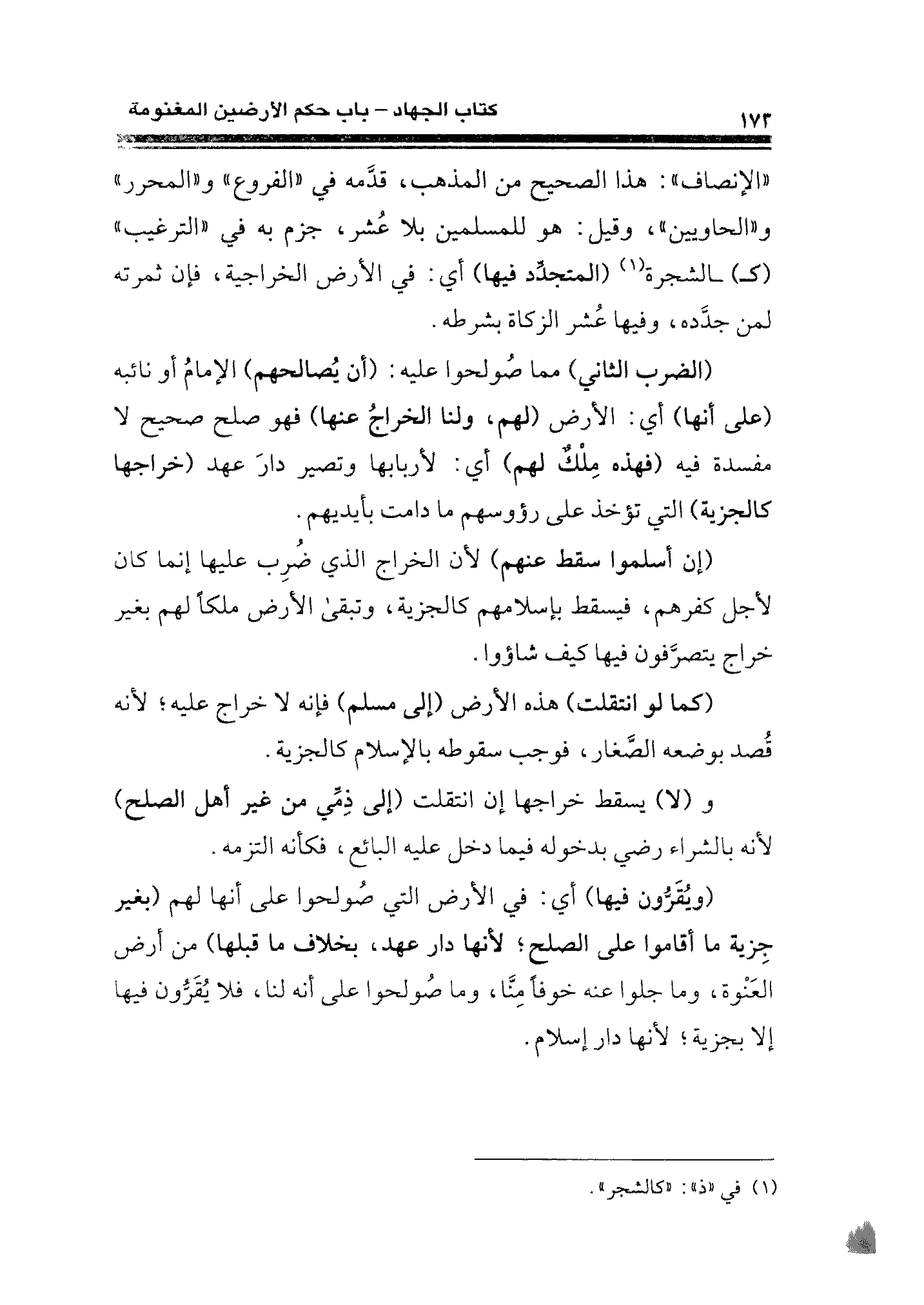 "الإنصاف": هذا الصحيح من المذهب، قدَّمه في "الفروع" و"المحرر" و"الحاويين"، وقيل: هو للمسلمين بلا عُشر، جزم به في "الترغيب" (كـ) ـالشجرة (¬١) (المتجدِّد فيها) أي: في الأرض الخراجية، فإن ثمرته لمن جدَّده، وفيها عُشر الزكاة بشرطه.