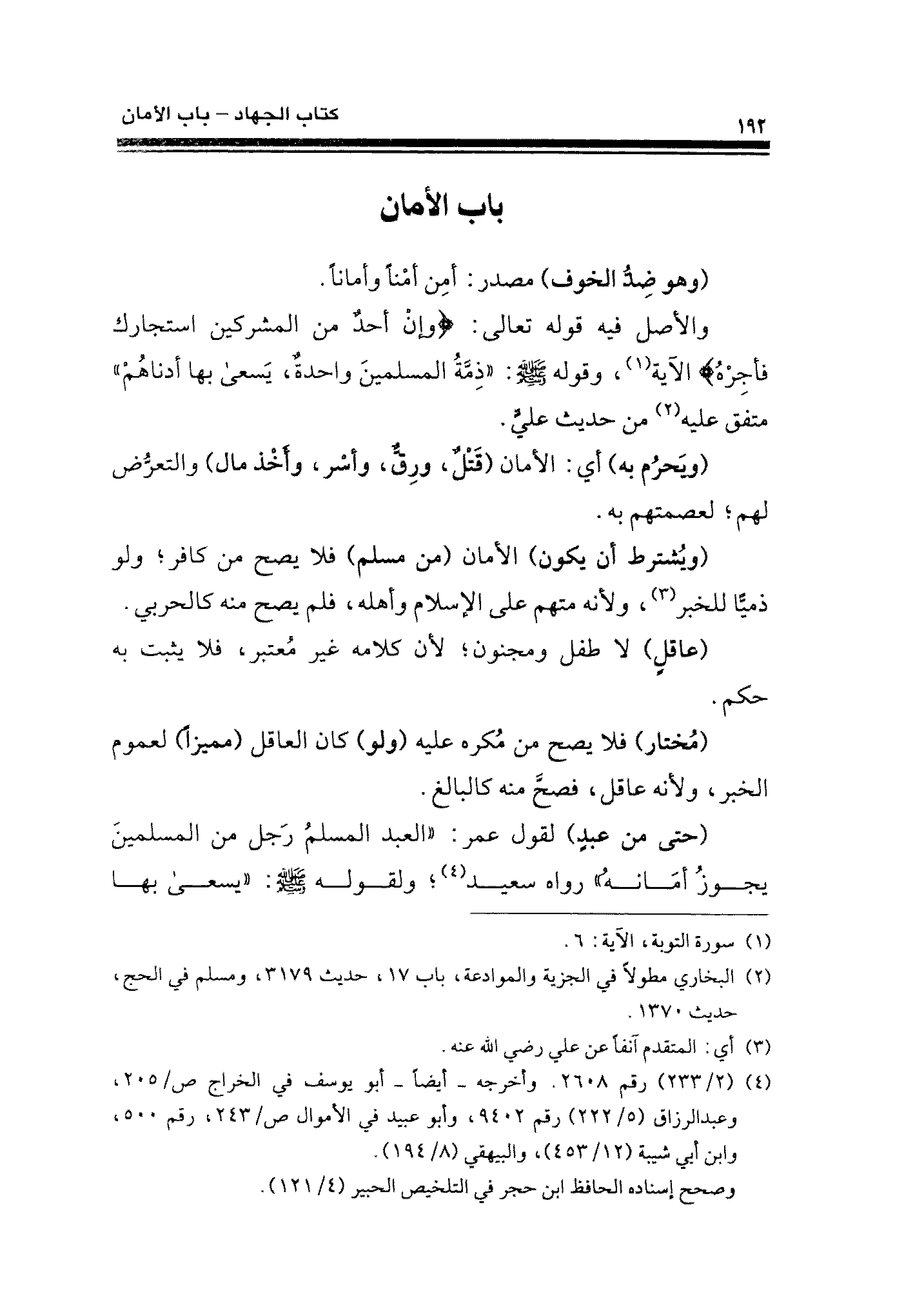 (حتى من عبدٍ) لقول عمر: "العبد المسلمُ رَجل من المسلمينَ يجوزُ أمَانهُ" رواه سعيد (¬٤)؛ ولقوله - صلى الله عليه وسلم -: "يسعى بها