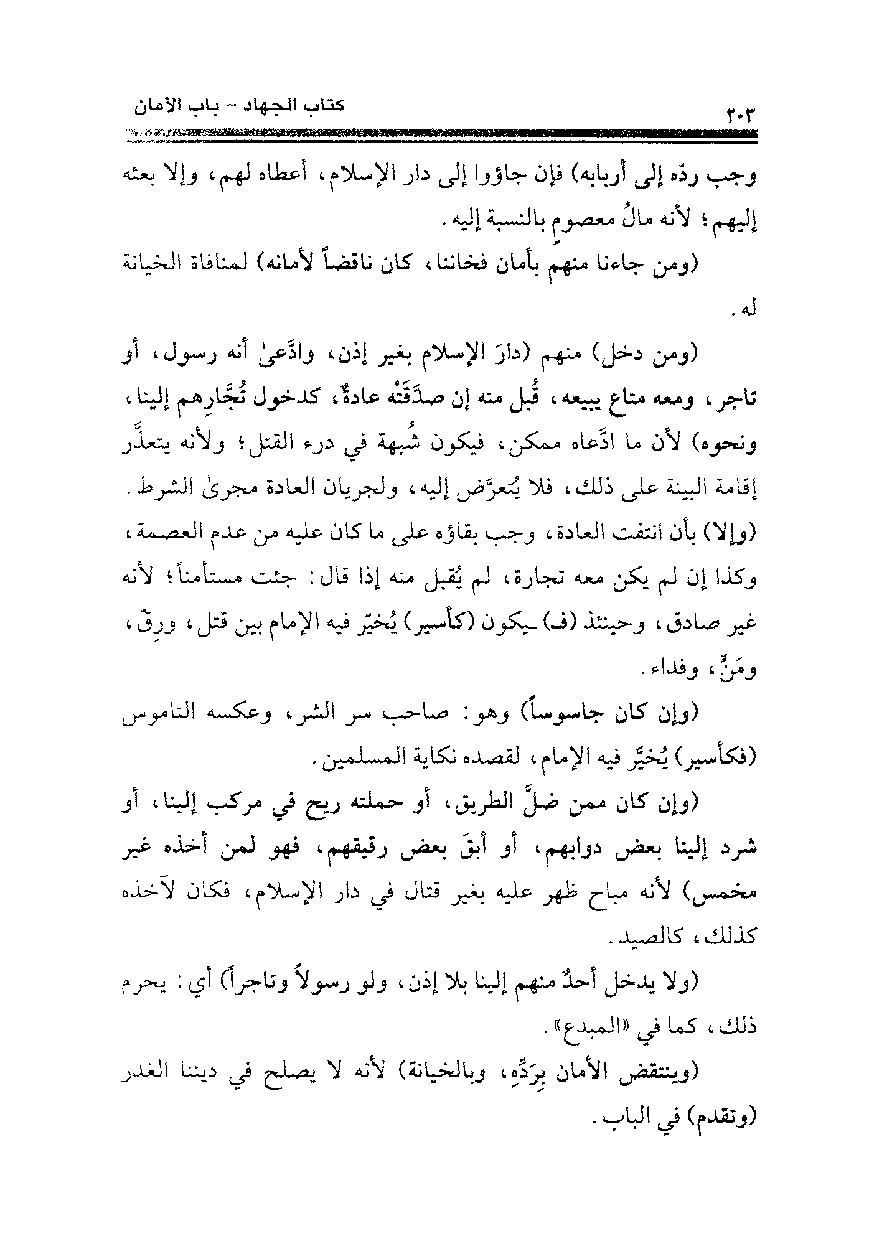 (ومن دخل) منهم (دارَ الإسلام بغير إذن، وادَّعى أنه رسول، أو تاجر، ومعه متاع يبيعه، قُبل منه إن صدَّقَتْه عادةٌ، كدخول تُجَّارِهم إلينا، ونحوه) لأن ما ادَّعاه ممكن، فيكون شُبهة في درء القتل؛ ولأنه يتعذَّر إقامة البينة على ذلك، فلا يُتعرَّض إليه، ولجريان العادة مجرى الشرط. (وإلا) بأن انتفت العادة، وجب بقاؤه على ما كان عليه من عدم العصمة، وكذا إن لم يكن معه تجارة، لم يُقبل منه إذا قال: جئت مستأمنًا؛ لأنه غير صادق، وحينئذ (فـ) ـكون (كأسير) يُخيّر فيه الإمام بين قتل، ورِقّ، ومَنٍّ، وفداء.