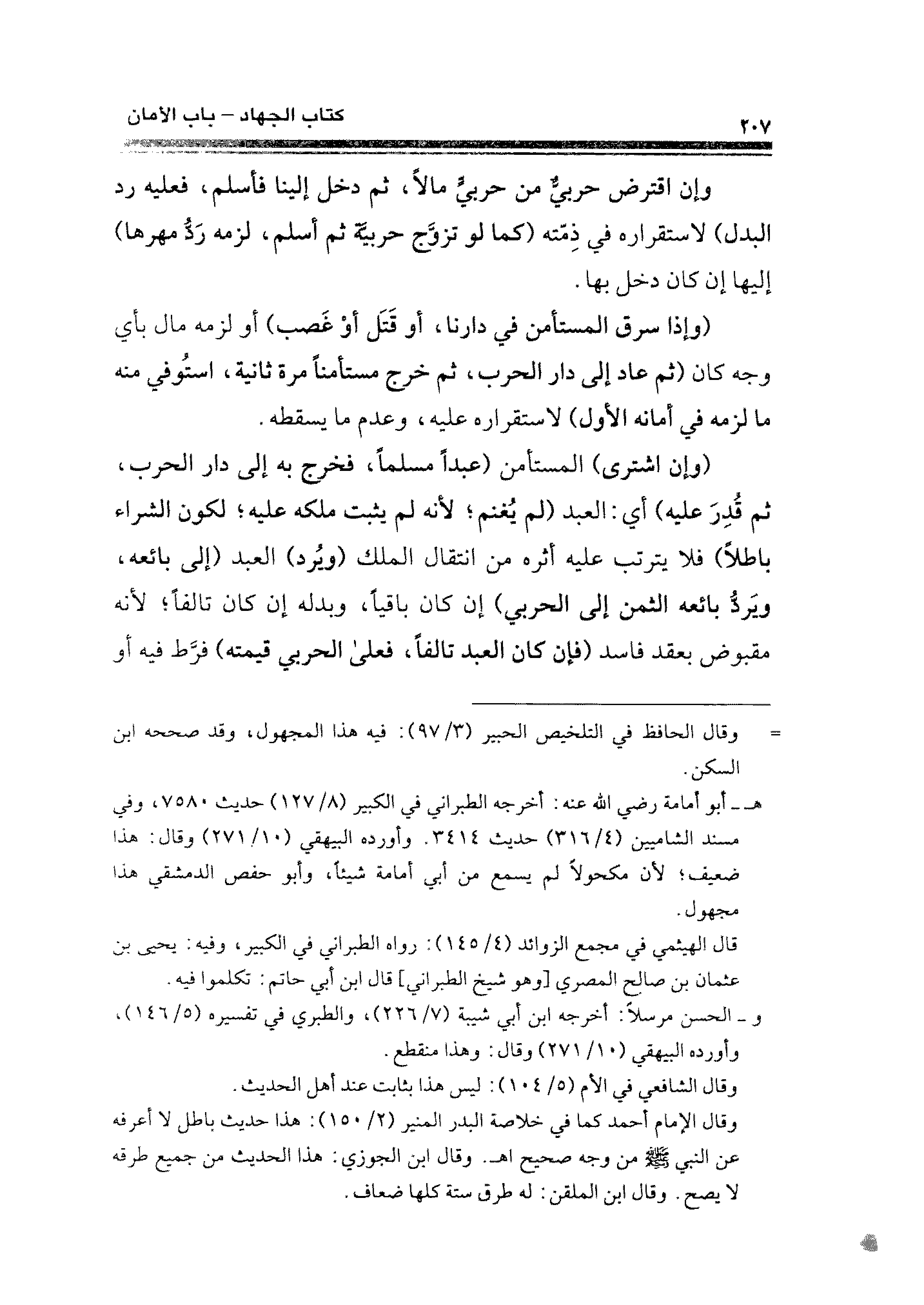 (وإن اشترى) المستأمن (عبدًا مسلمًا، فخرج به إلى دار الحرب، ثم قُدِرَ عليه) أي: العبد (لم يُغنم؛ لأنه لم يثبت ملكه عليه؛ لكون الشراء باطلًا) فلا يترتب عليه أثره من انتقال الملك (ويُرد) العبد (إلى بائعه، ويَردُّ بائعه الثمن إلى الحربي) إن كان باقيًا، وبدله إن كان تالفًا؛ لأنه مقبوض بعقد فاسد (فإن كان العبد تالفًا، فعلى الحربي قيمته) فرَّط فيه أو