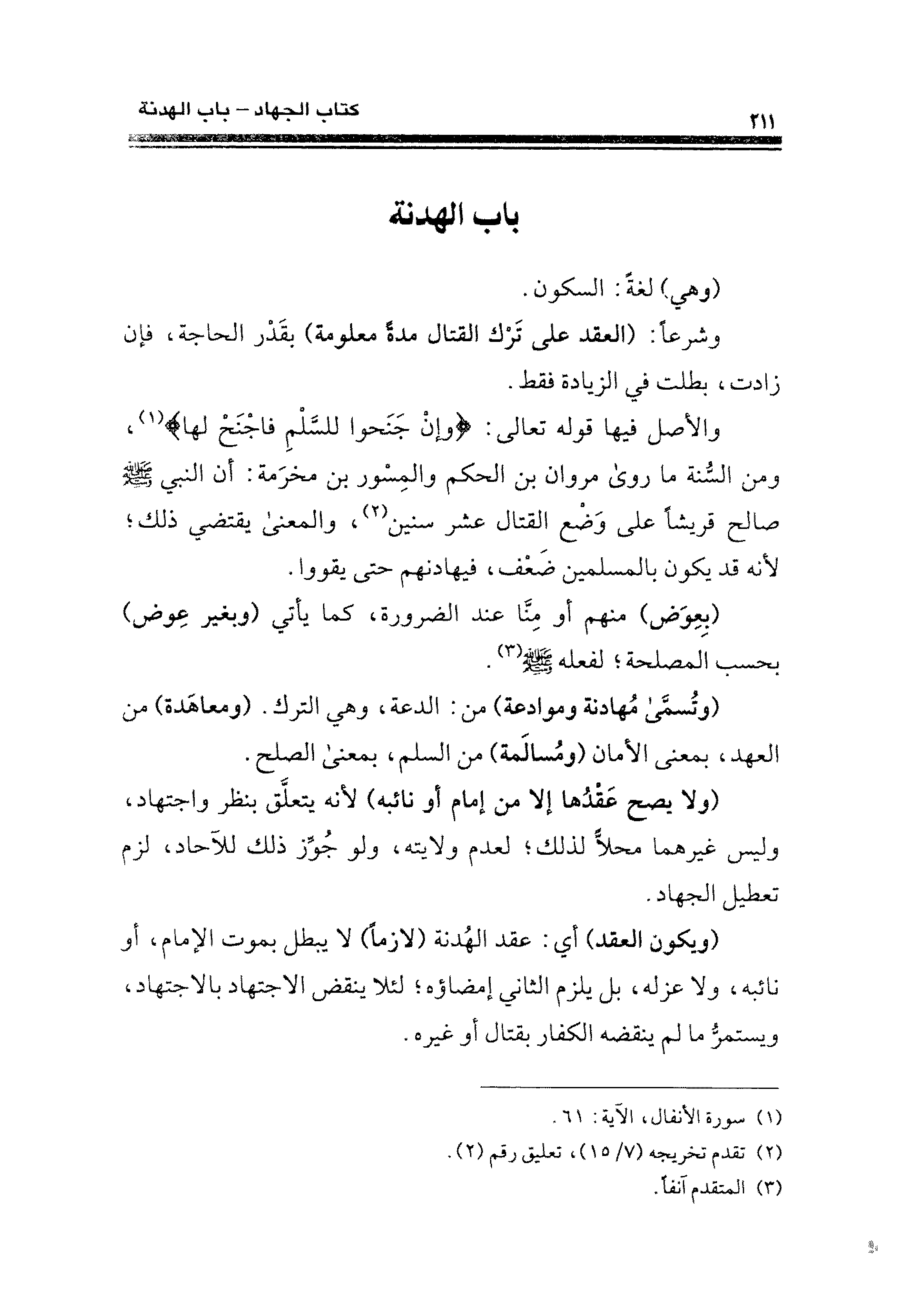 (وتُسمَّى مُهادنة وموادعة) من: الدعة، وهي الترك. (ومعاهَدة) من العهد، بمعنى الأمان (ومُسالمَة) عن السلم، بمعنى الصلح.
