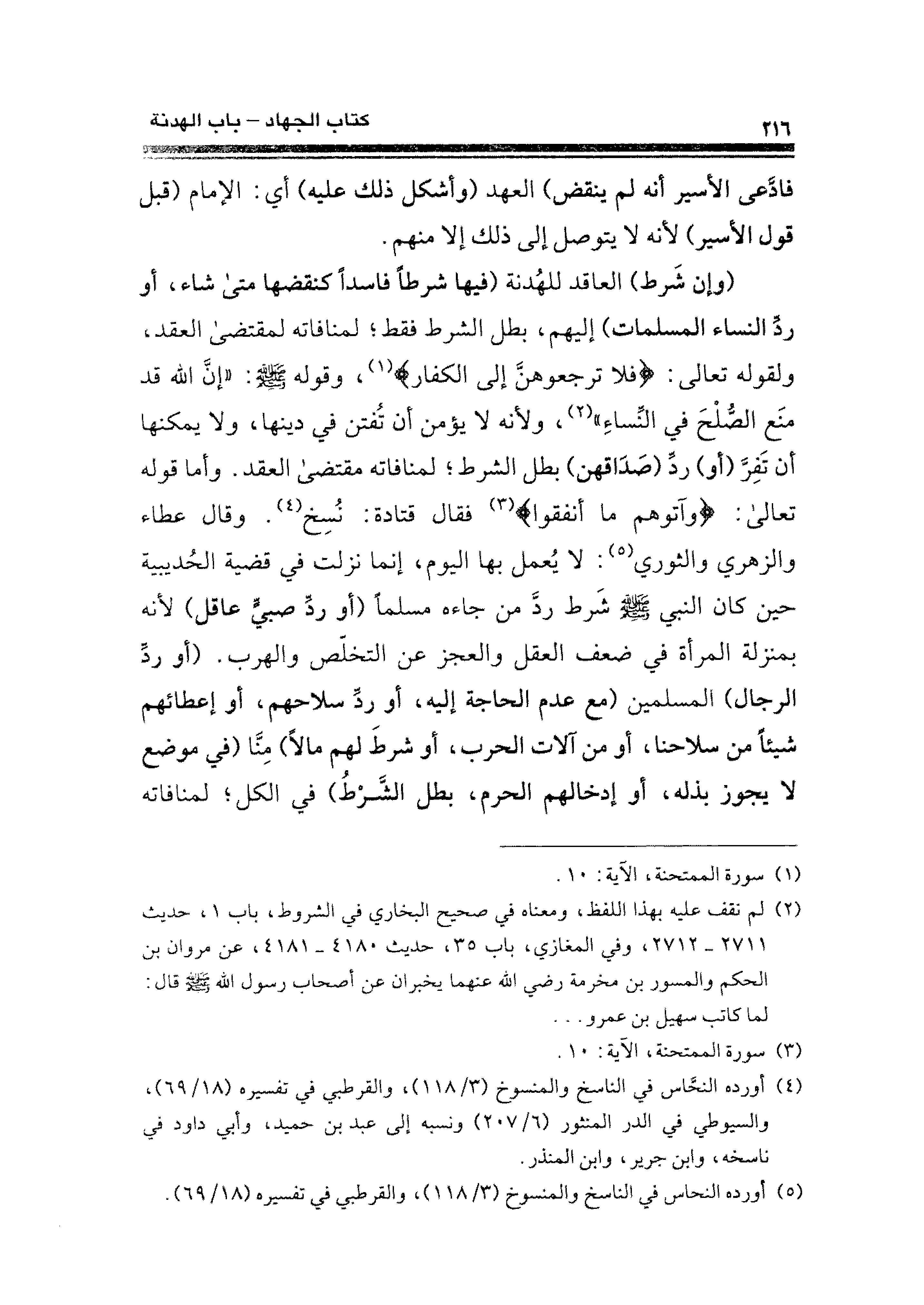 (وإن شَرط) -العاقد للهُدنة (فيها شرطًا فاسدًا كنقضها متى شاء، أو ردِّ النساء المسلمات) إليهم، بطل الشرط فقط؛ لمنافاته لمقتضى العقد، ولقوله تعالى: {فَلَا تَرْجِعُوهُنَّ إِلَى الْكُفَّارِ} (¬١)، وقوله - صلى الله عليه وسلم -: "إنَّ الله قد منَع الصُّلْحَ في النِّساءِ" (¬٢)، ولأنه لا يؤمن أن تُفتن في دينها، ولا يمكنها أن تَفِرَّ (أو) ردِّ (صَدَاقهن) بطل الشرط؛ لمنافاته مقتضى العقد. وأما قوله تعالى: {وَآتُوهُمْ مَا أَنْفَقُوا} (¬٣) فقال قتادة: نُسِخ (¬٤). وقال عطاء والزهري والثوري (¬٥): لا يُعمل بها اليوم، إنما نزلت في قضية الحُديبية حين كان النبي - صلى الله عليه وسلم - شَرط ردَّ عن جاءه مسلمًا (أو ردِّ صبيٍّ عاقل) لأنه بمنزلة المرأة في ضعف العقل والعجز عن التخلّص والهرب. (أو ردِّ الرجال) المسلمين (مع عدم الحاجة إليه، أو ردِّ صلاحهم، أو إعطائهم شيئًا من سلاحنا، أو من آلات الحرب، أو شرطَ لهم مالًا) مِنَّا (في موضع لا يجوز بذله، أو إدخالهم الحرم، بطل الشَّرْطُ) في الكل؛ لمنافاته