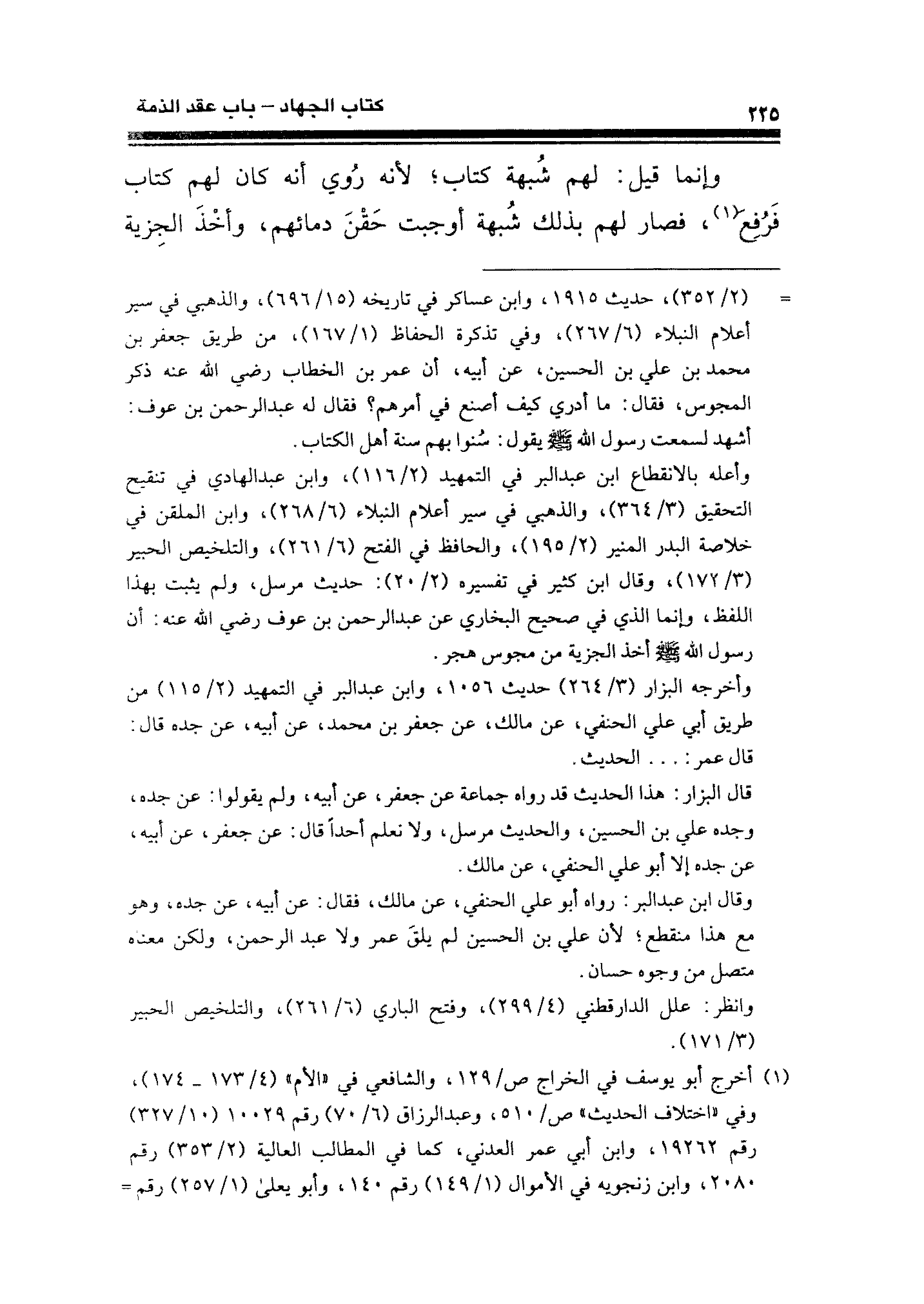 = (٢/ ٣٥٢)، حديث ١٩١٥، وابن عساكر في تاريخه (١٥/ ٦٩٦)، والذهبي في سير أعلام النبلاء (٦/ ٢٦٧)، وفي تذكرة الحفاظ (١/ ١٦٧)، من طريق جعفر بن محمد بن علي بن الحسين، عن أبيه، أن عمر بن الخطاب - رضي الله عنه - ذكر المجوس، فقال: ما أدري كيف أصنع في أمرهم؟ فقال له عبد الرحمن بن عوف: أشهد لسمعت رسول الله - صلى الله عليه وسلم - يقول: سُنوا بهم سنة أهل الكتاب.