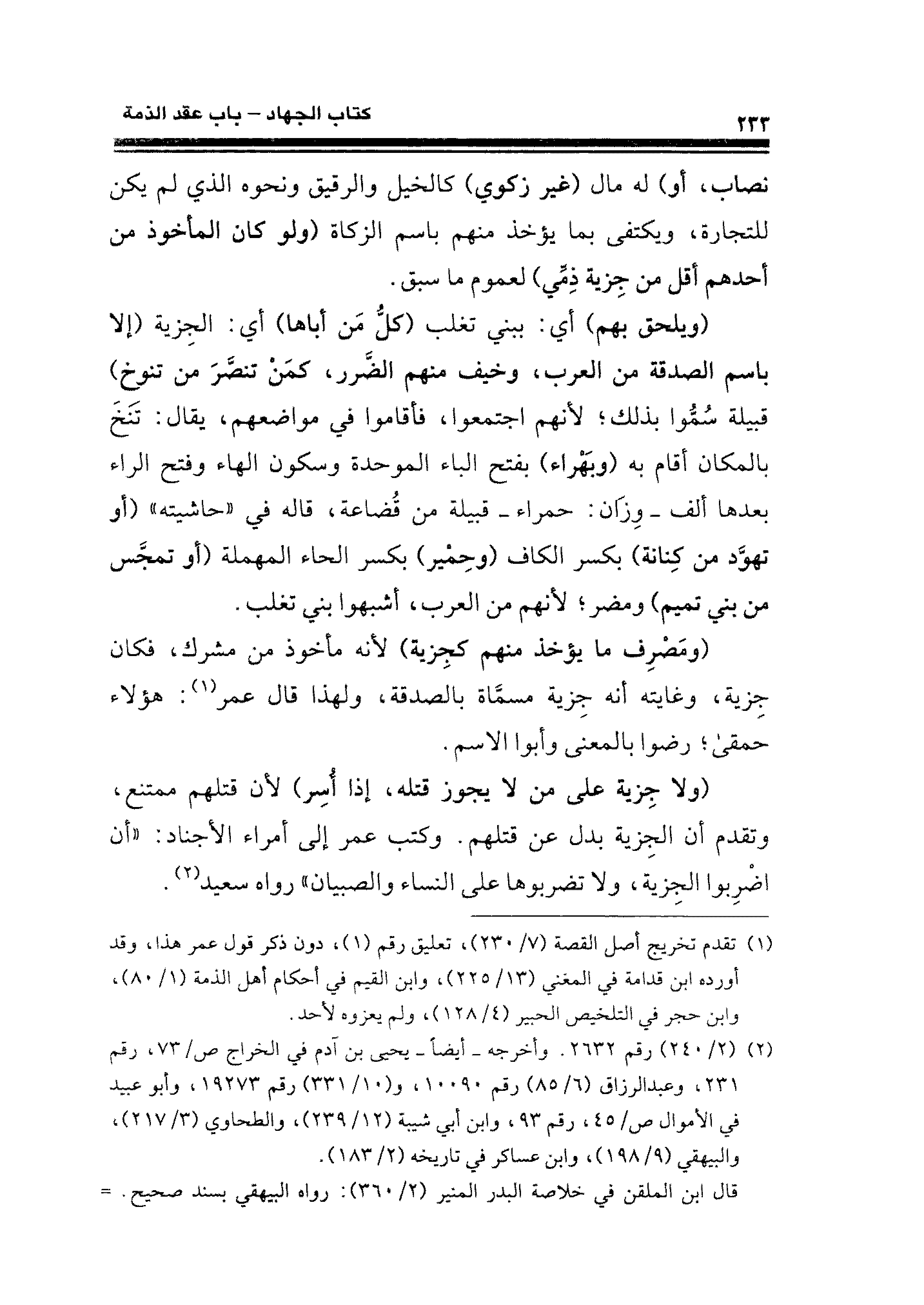 (ويلحق بهم) أي: ببني تغلب (كلُّ مَن أباها) أي: الجِزية (إلا باسم الصدقة من العرب، وخيف منهم الضَّرر، كمَنْ تنصَّرَ من تنوخ) قبيلة سُمُّوا بذلك؛ لأنهم أجتمعوا، فأقاموا في مواضعهم، يقال: تَنَخَ بالمكان أقام به (وبَهْراء) بفتح الباء الموحدة وسكون الهاء وفتح الراء بعدها ألف - وِزَان: حمراء - قبيلة من قُضاعة، قاله في "حاشيته"، (أو تهوَّد من كِنانة) بكسر الكاف (وحِمْير) بكسر الحاء المهملة (أو تمجَّس من بني تميم) ومضر؛ لأنهم من العرب، أشبهوا بني تغلب.