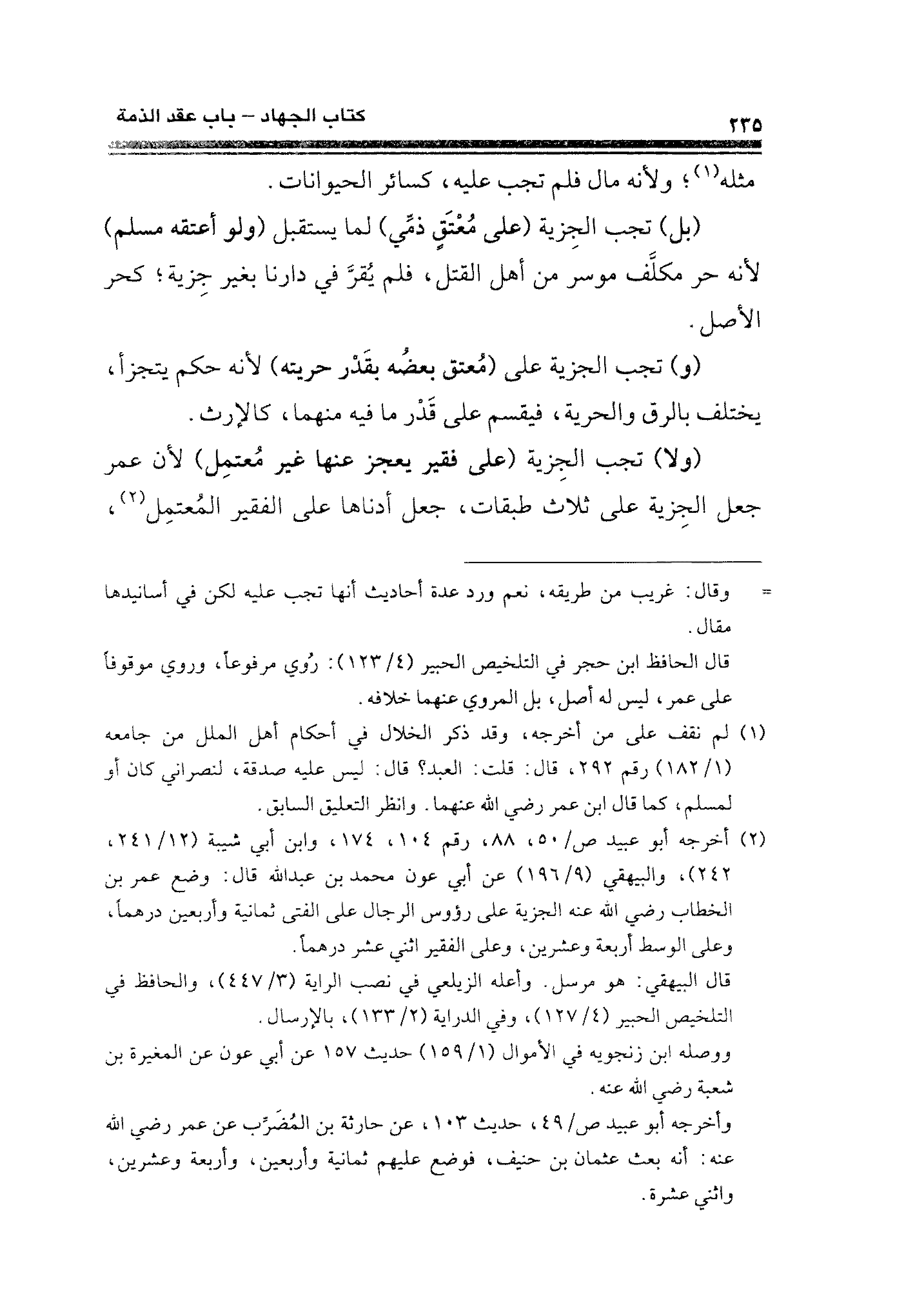 (ولا) تجب الجِزية (على فقير يعجز عنها غير مُعتمِل) لأن عمر جعل الجِزية على ثلاث طبقات، جعل أدناها على الفقير المُعتمِل (¬٢)،