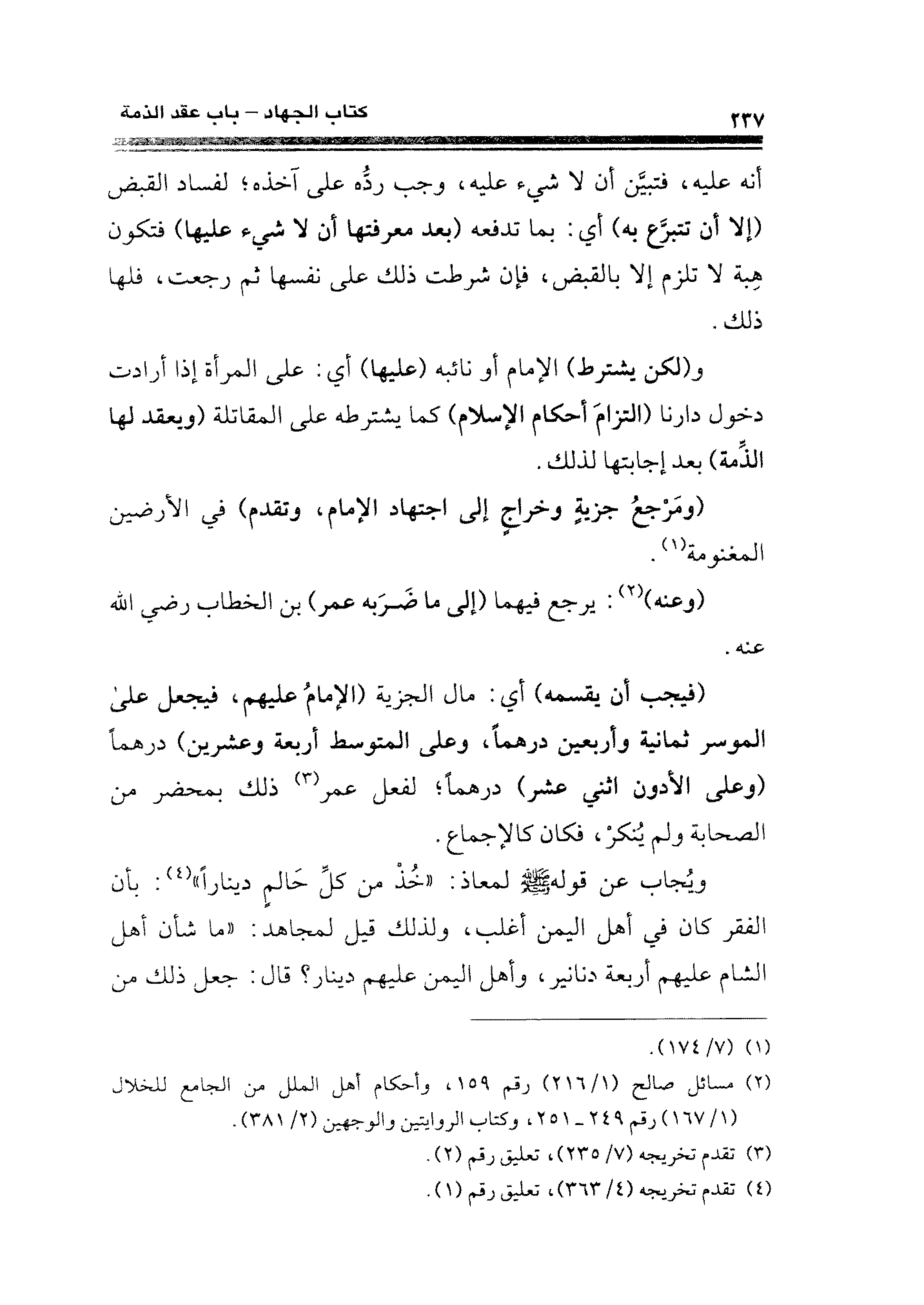 ويُجاب عن قوله - صلى الله عليه وسلم - لمعاذ: "خُذْ من كلِّ حَالمٍ دينارًا" (¬٤): بأن الفقر كان في أهل اليمن أغلب، ولذلك قيل لمجاهد: "ما شأن أهل الشام عليهم أربعة دنانير، وأهل اليمن عليهم دينار؟ قال: جعل ذلك من