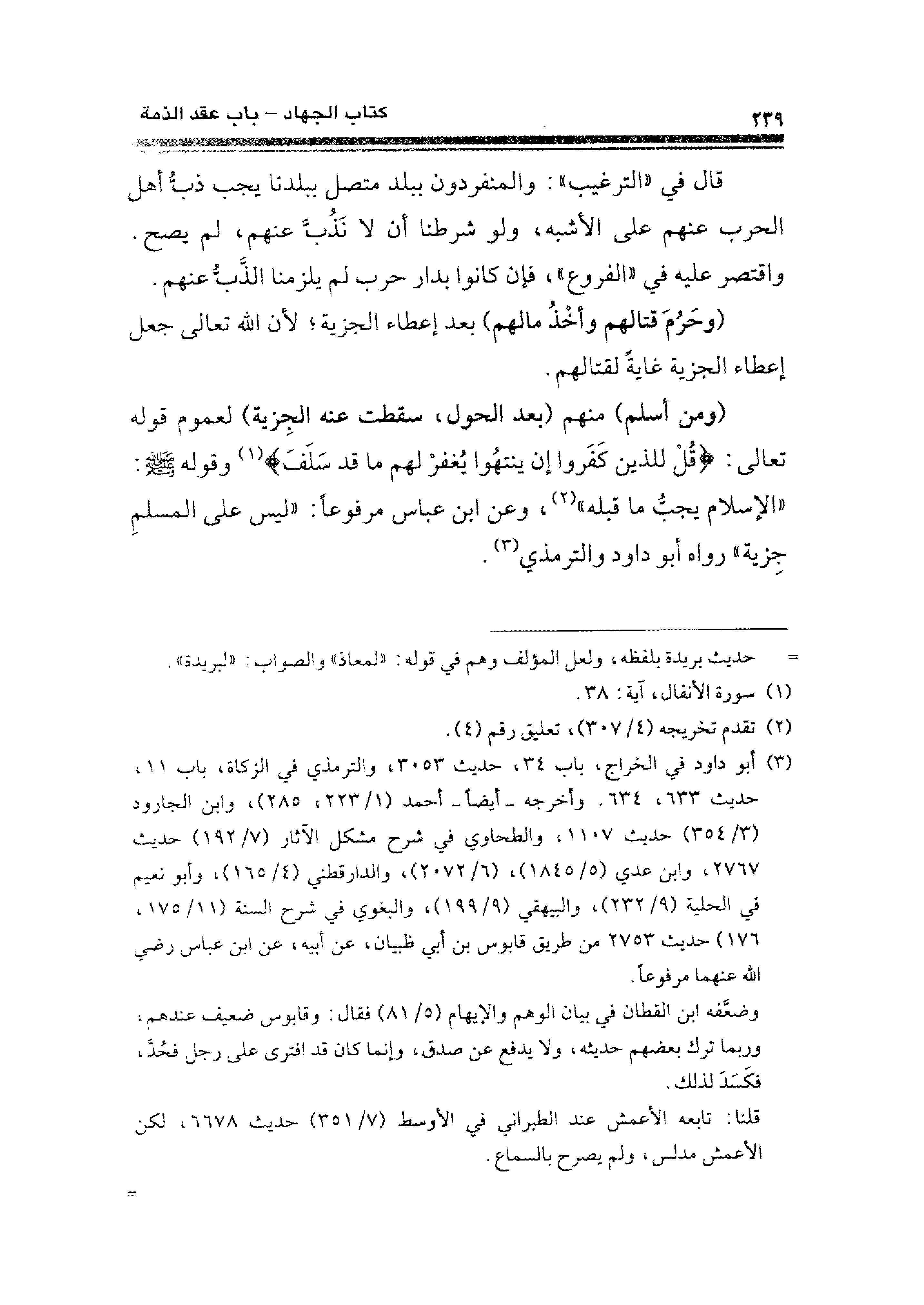 (ومن أسلم) منهم (بعد الحول، سقطت عنه الجِزية) لعموم قوله تعالى: {قُلْ لِلَّذِينَ كَفَرُوا إِنْ يَنْتَهُوا يُغْفَرْ لَهُمْ مَا قَدْ سَلَفَ} (¬١) وقوله - صلى الله عليه وسلم -: "الإسلام يجبُّ ما قبله" (¬٢)، وعن ابن عباس مرفوعًا: "ليس على المسلمِ جِزية" رواه أبو داود والترمذي (¬٣).