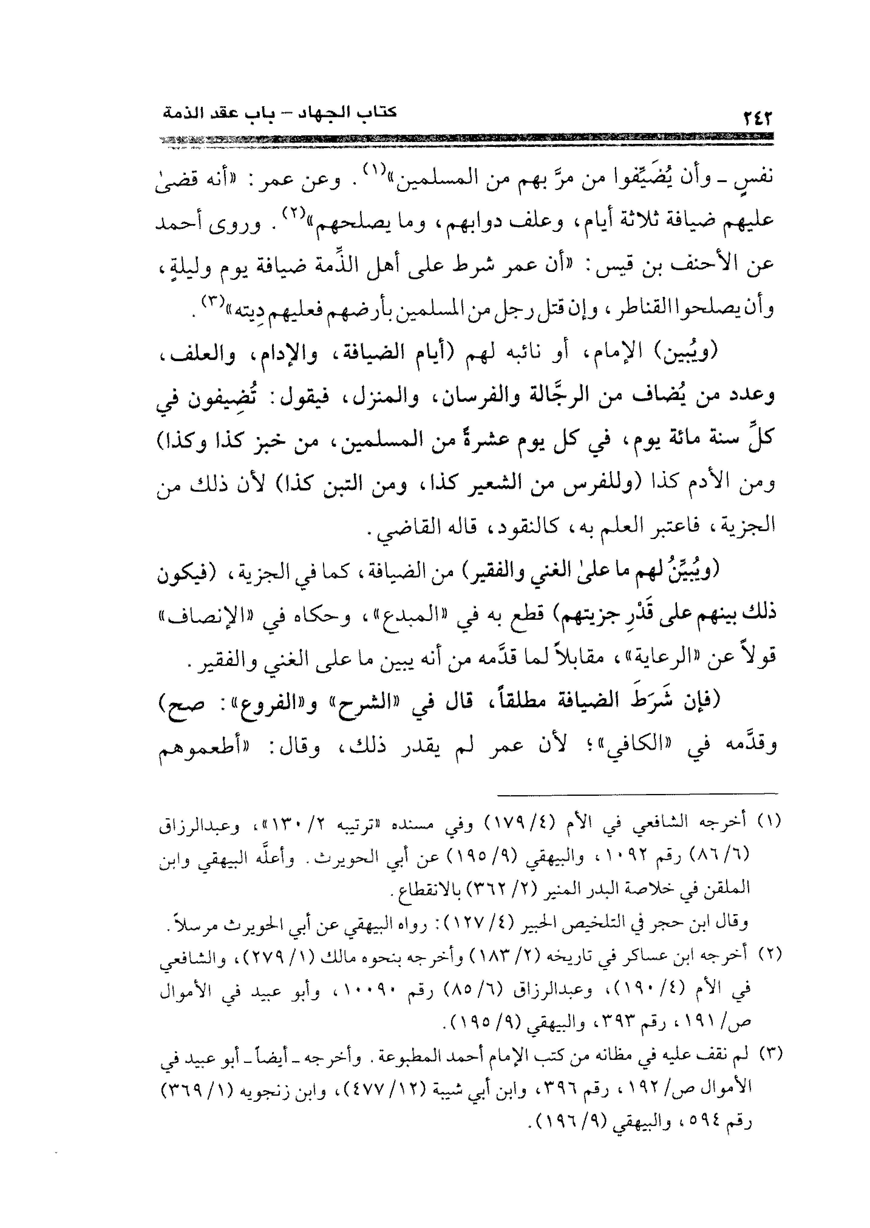 نفسٍ- وأن يُضَيِّفوا من مرَّ بهم من المسلمين" (¬١). وعن عمر: "أنه قضى عليهم ضيافة ثلاثة أيام، وعلف دوابهم، وما يصلحهم" (¬٢). وروى أحمد عن الأحنف بن قيس: "أن عمر شرط على أهل الذِّمة ضيافة يوم وليلةٍ، وأن يصلحوا القناطر، وإن قتل رجل من المسلمين بأرضهم فعليهم دِيته" (¬٣).