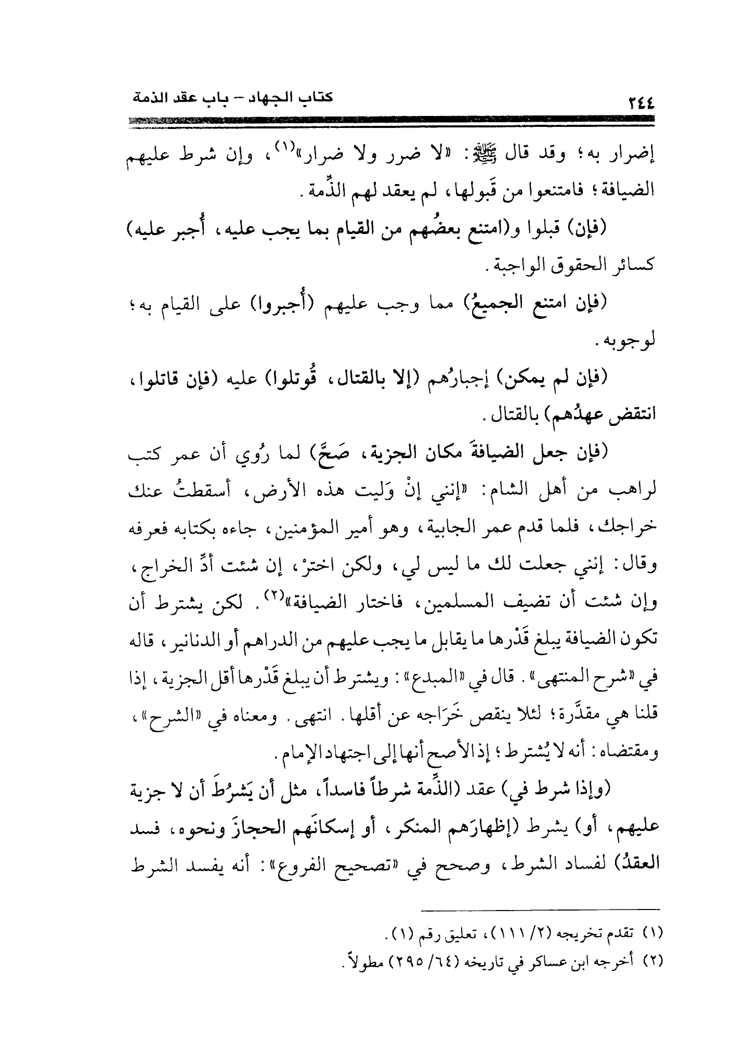 (فإن جعل الضيافةَ مكان الجزية، صَحَّ) لما رُوي أن عمر كتب لراهب من أهل الشام: "إنني إنْ وَليت هذه الأرض، أسقطتُ عنك خراجك، فلما قدم عمر الجابية، وهو أمير المؤمنين، جاءه بكتابه فعرفه وقال: إنني جعلت لك ما ليس لي، ولكن اخترْ، إن شئت أدِّ الخراج، وإن شئت أن تضيف المسلمين، فاختار الضيافة" (¬٢). لكن يشترط أن تكون الضيافة يبلغ قَدْرها ما يقابل ما يجب عليهم من الدراهم أو الدنانير، قاله في "شرح المنتهى". قال في "المبدع": ويشترط أن يبلغ قَدْرها أقل الجزية، إذا قلنا هي مقدَّرة؛ لئلا ينقص خَرَاجه عن أقلها، انتهى. ومعناه في "الشرح"، ومقتضاه: أنه لا يُشترط؛ إذ الأصح أنها إلى اجتهاد الإمام.
