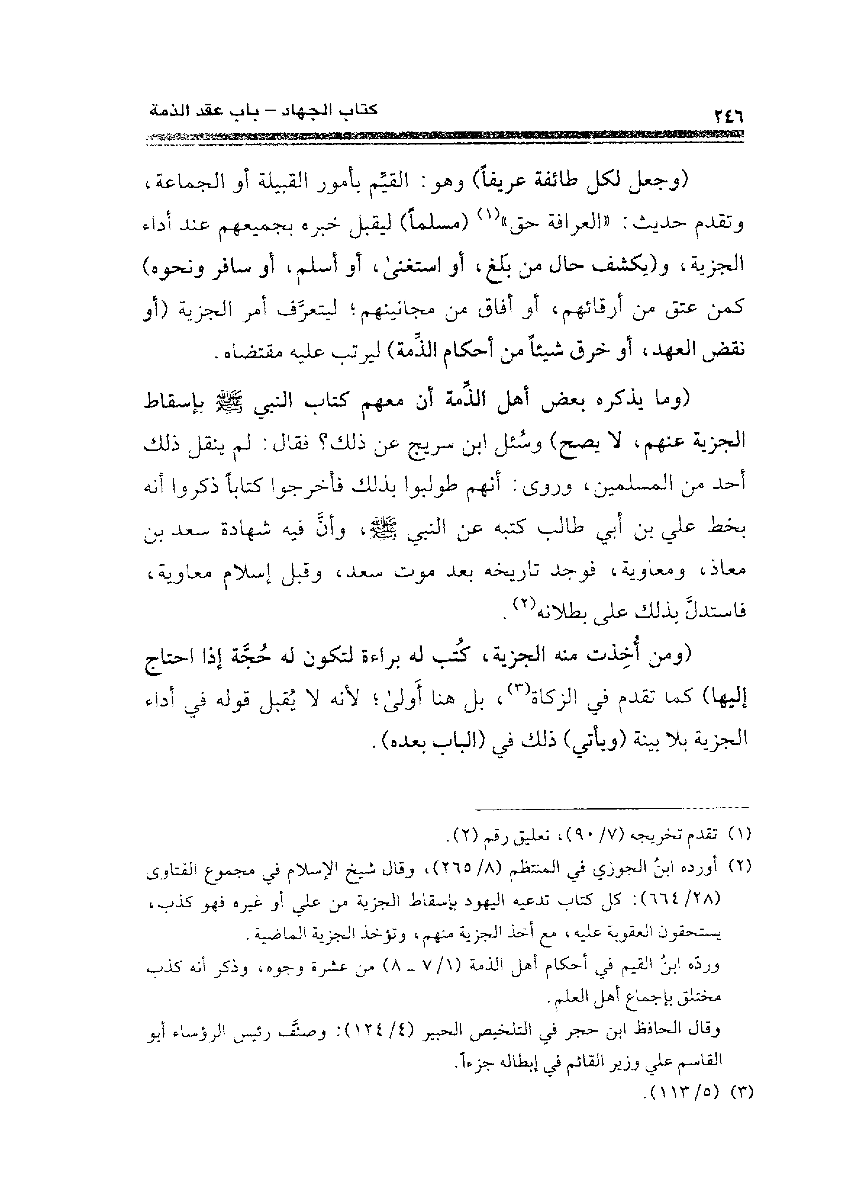 (وجعل لكل طائفة عريفًا) وهو: القيِّم بأمور القبيلة أو الجماعة، وتقدم حديث: "العرافة حق" (¬١) (مسلمًا) ليقبل خبره بجميعهم عند أداء الجزية، و (يكشف حال من بَلغ، أو استغنى، أو أسلم، أو سافر ونحوه) كمن عتق من أرقائهم، أو أفاق عن مجانينهم؛ ليتعرَّف أمر الجزية (أو نقض العهد، أو خرق شيئًا من أحكام الذِّمة) ليرتب عليه مقتضاه.