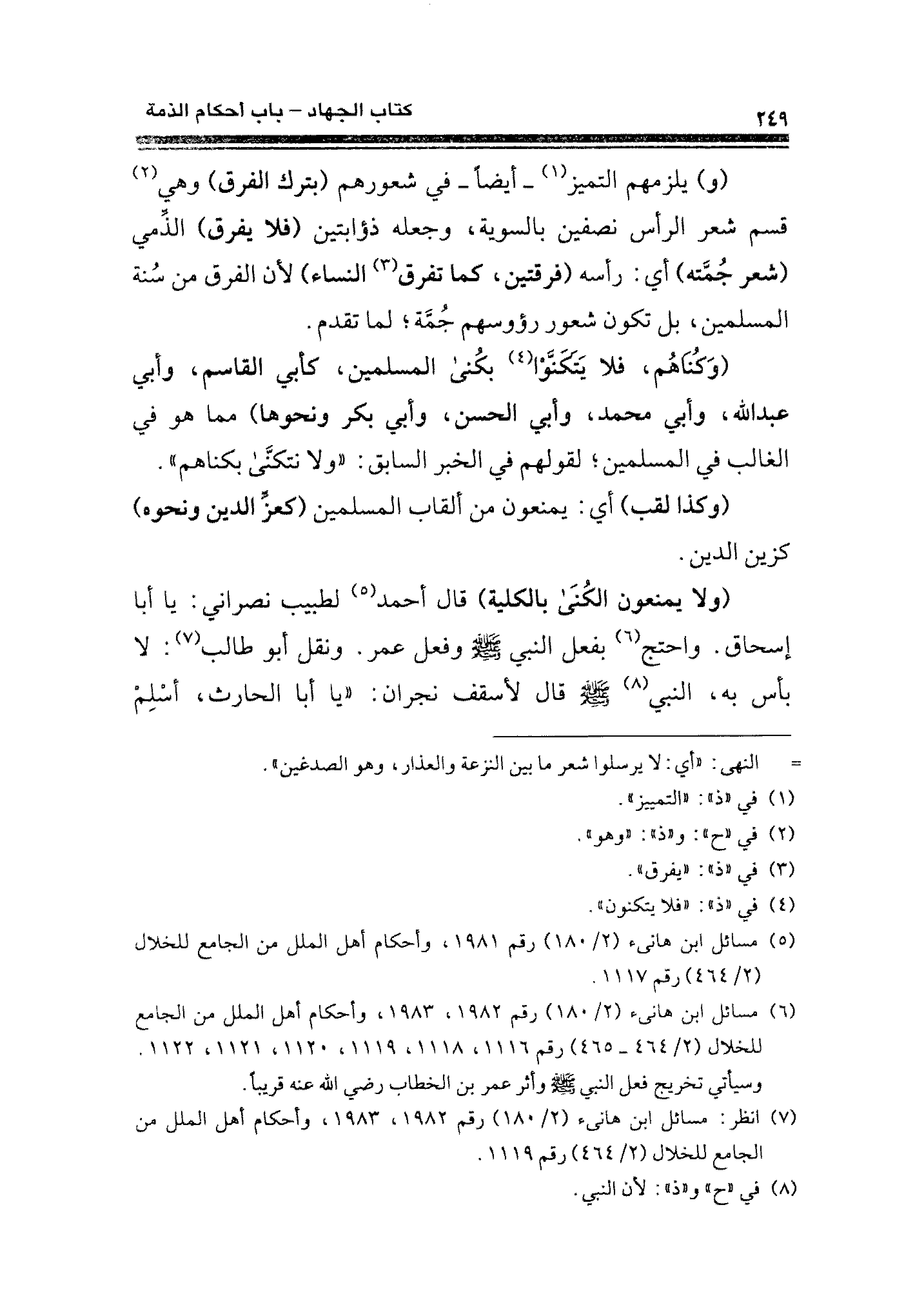 (ولا يمنعون الكُنَى بالكلية) قال أحمد (¬٥) لطبيب نصراني: يا أبا إسحاق. واحتج (¬٦) بفعل النبي - صلى الله عليه وسلم - وفعل عمر. ونقل أبو طالب (¬٧): لا بأس به، النبي (¬٨) - صلى الله عليه وسلم - قال لأسقف نجران: "يا أبا الحارث، أسْلِمْ