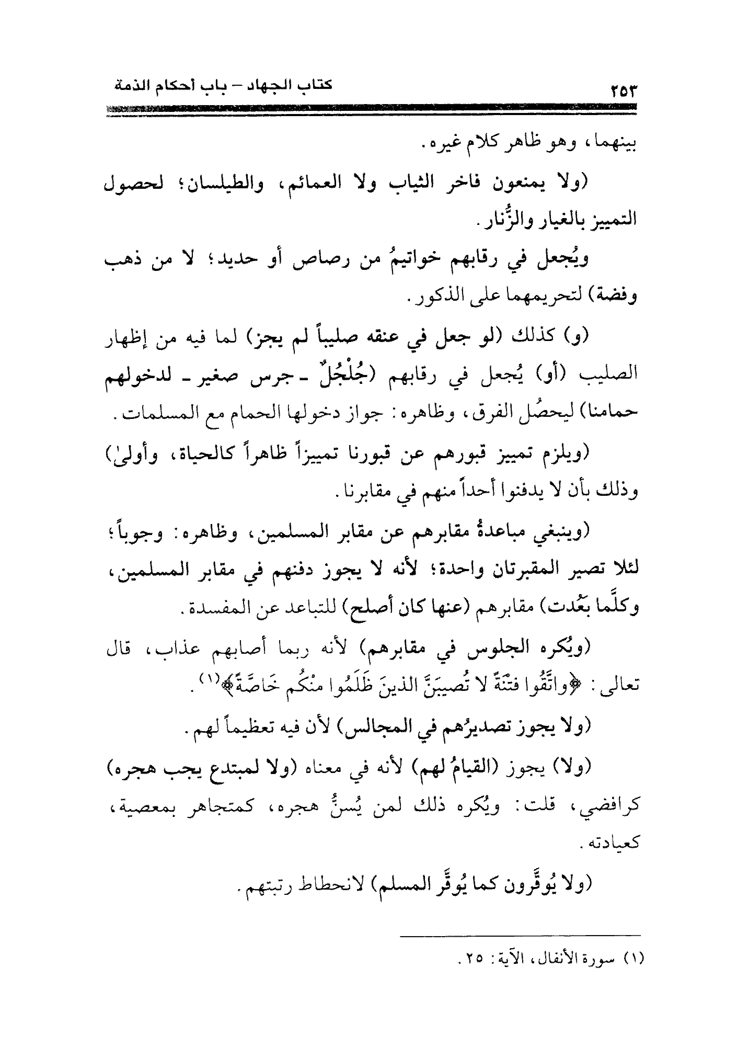 (ويُكره الجلوس في مقابرهم) لأنه ربما أصابهم عذاب، قال تعالى: {وَاتَّقُوا فِتْنَةً لَا تُصِيبَنَّ الَّذِينَ ظَلَمُوا مِنْكُمْ خَاصَّةً} (¬١).