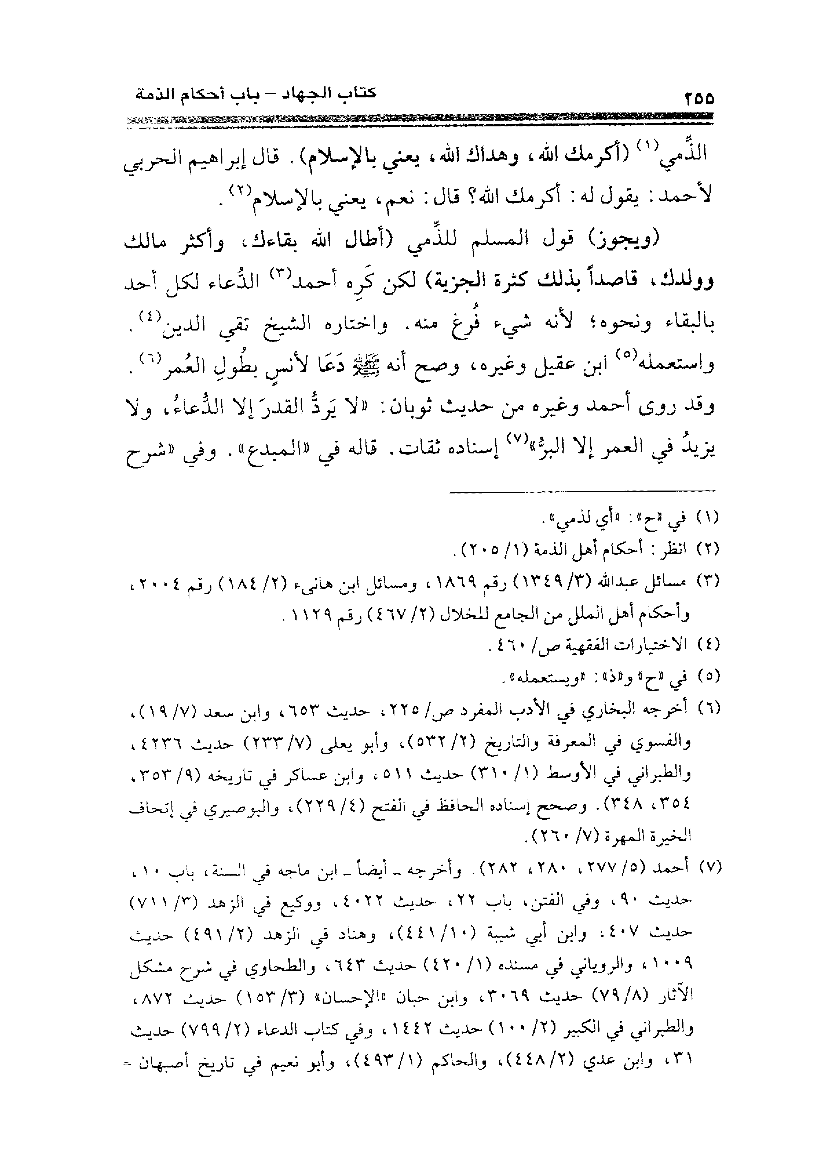 (ويجوز) قول المسلم للذِّمي (أطال الله بقاءك، وأكثر مالك وولدك، قاصدًا بذلك كثرة الحزية) لكن كَرِه أحمد (¬٣) الدُّعاء لكل أحد بالبقاء ونحوه؛ لأنه شيء فُرغ منه. واختاره الشيخ تقي الدين (¬٤).