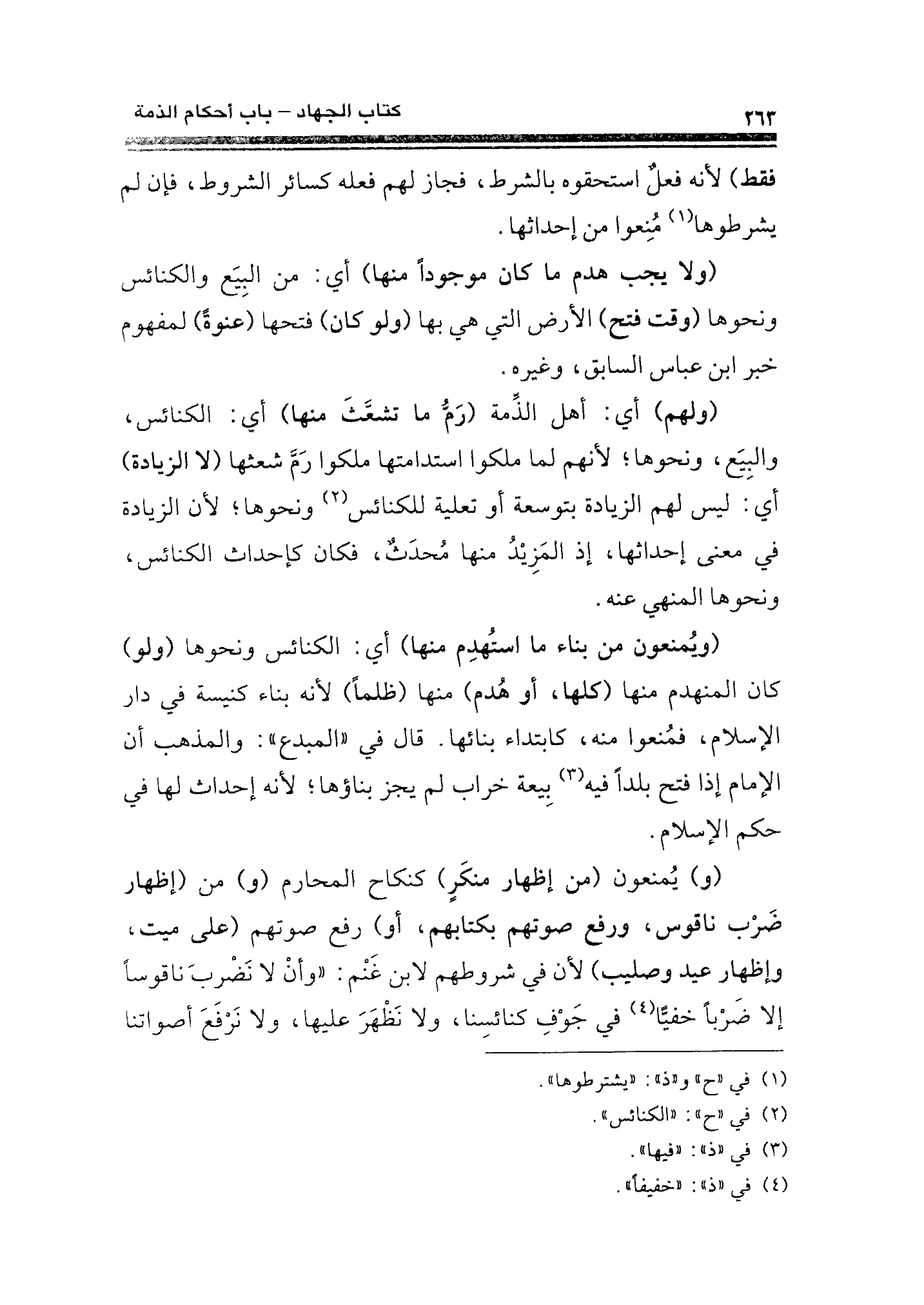 (ولهم) أي: أهل الذِّمة (رَمُّ ما تشعَّثَ منها) أي: الكنائس، والبِيَع، ونحوها؛ لأنهم لما ملكوا استدامتها ملكوا رَمَّ شعثها (لا الزيادة) أي: ليس لهم الزيادة بتوسعة أو تعلية للكنائس (¬٢) ونحوها؛ لأن الزيادة في معنى إحداثها، إذ المَزِيدُ منها مُحدَثٌ، فكان كإحداث الكنائس، ونحوها المنهي عنه.