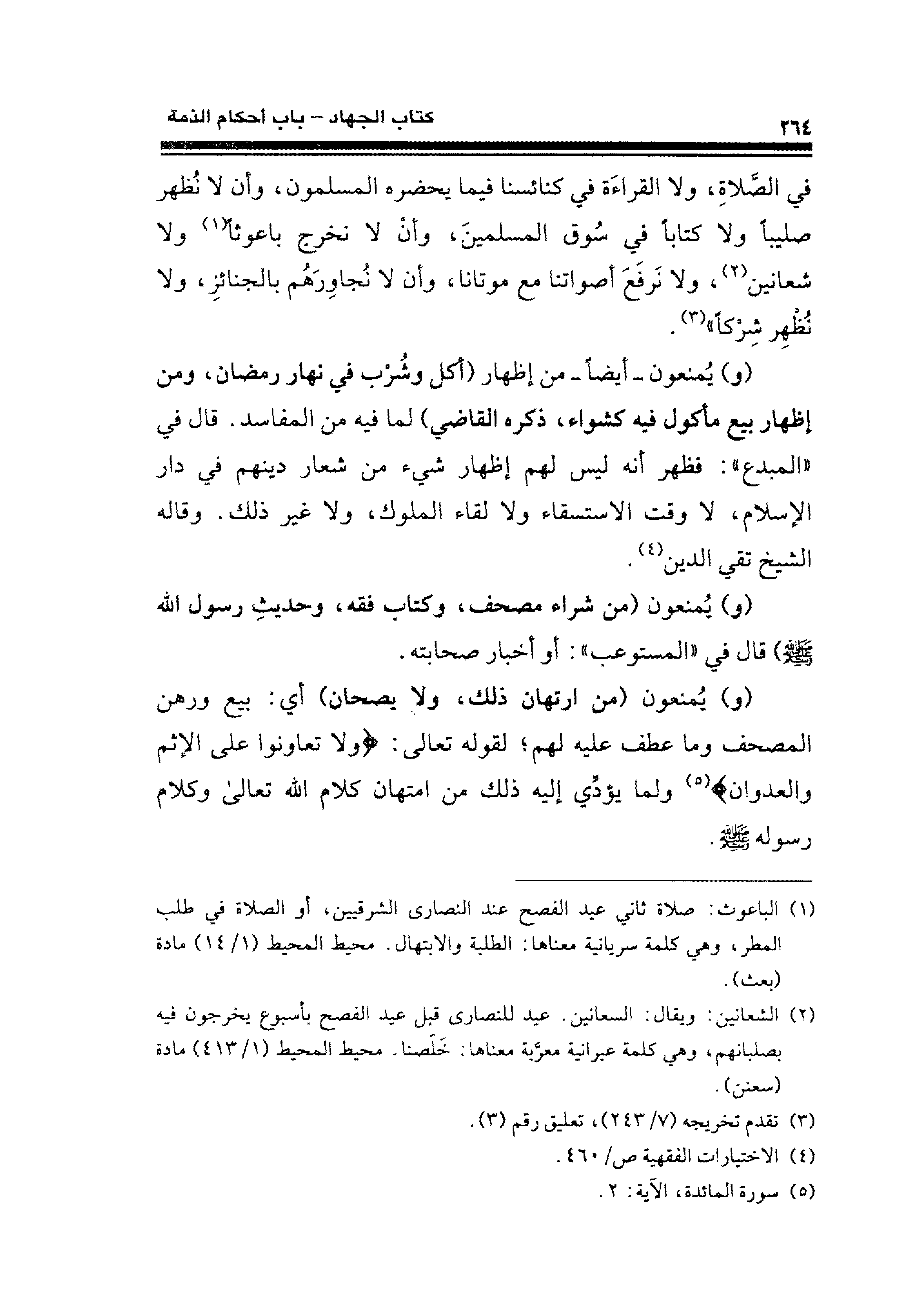في الصَّلاةِ، ولا القراءَة في كنائسنا فيما يحضره المسلمون، وأن لا نُظهر صليبًا ولا كتابًا في سُوق المسلمينَ، وأنْ لا نخرج باعوثًا (¬١) ولا شعانين (¬٢)، ولا نَرفَعَ أصواتنا مع موتانا، وأن لا نُجاورَهُم بالجنائزِ، ولا نُظْهِر شِرْكًا" (¬٣).