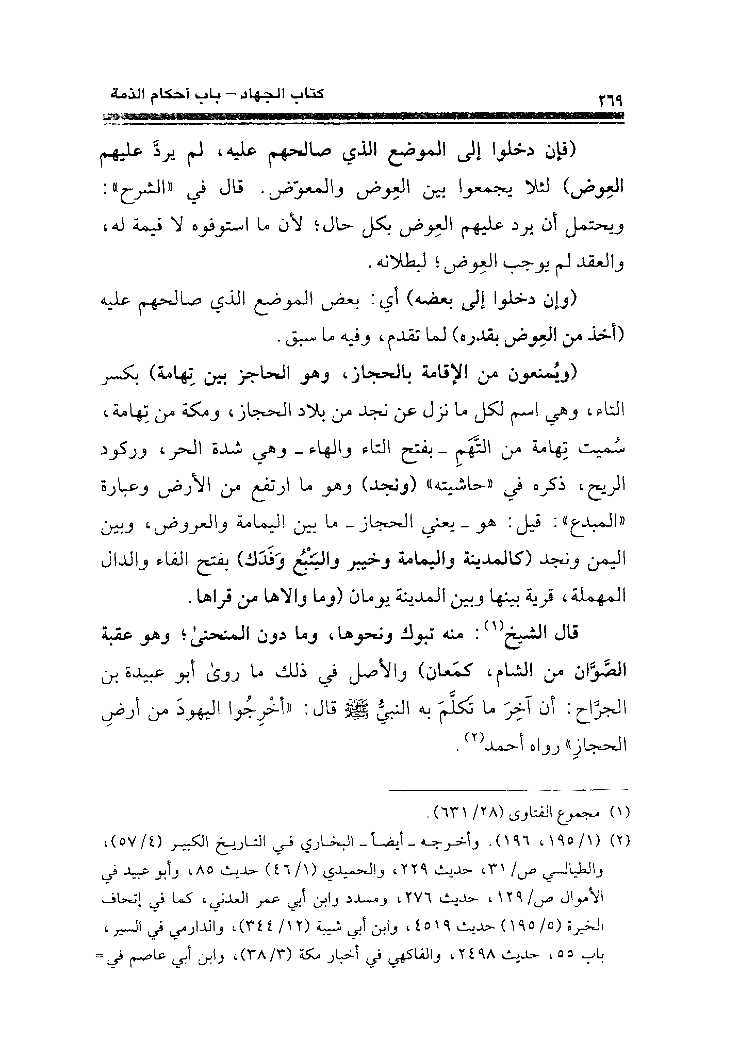 قال الشيخ (¬١): منه تبوك ونحوها، وما دون المنحنى؛ وهو عقبة الصَّوَّان من الشام، كمَعان) والأصل في ذلك ما روى أبو عبيدة بن الجرَّاح: أن آخِرَ ما تَكلَّمَ به النبيُّ - صلى الله عليه وسلم - قال: "أخْرِجُوا اليهودَ من أرضِ الحجازِ" رواه أحمد (¬٢).