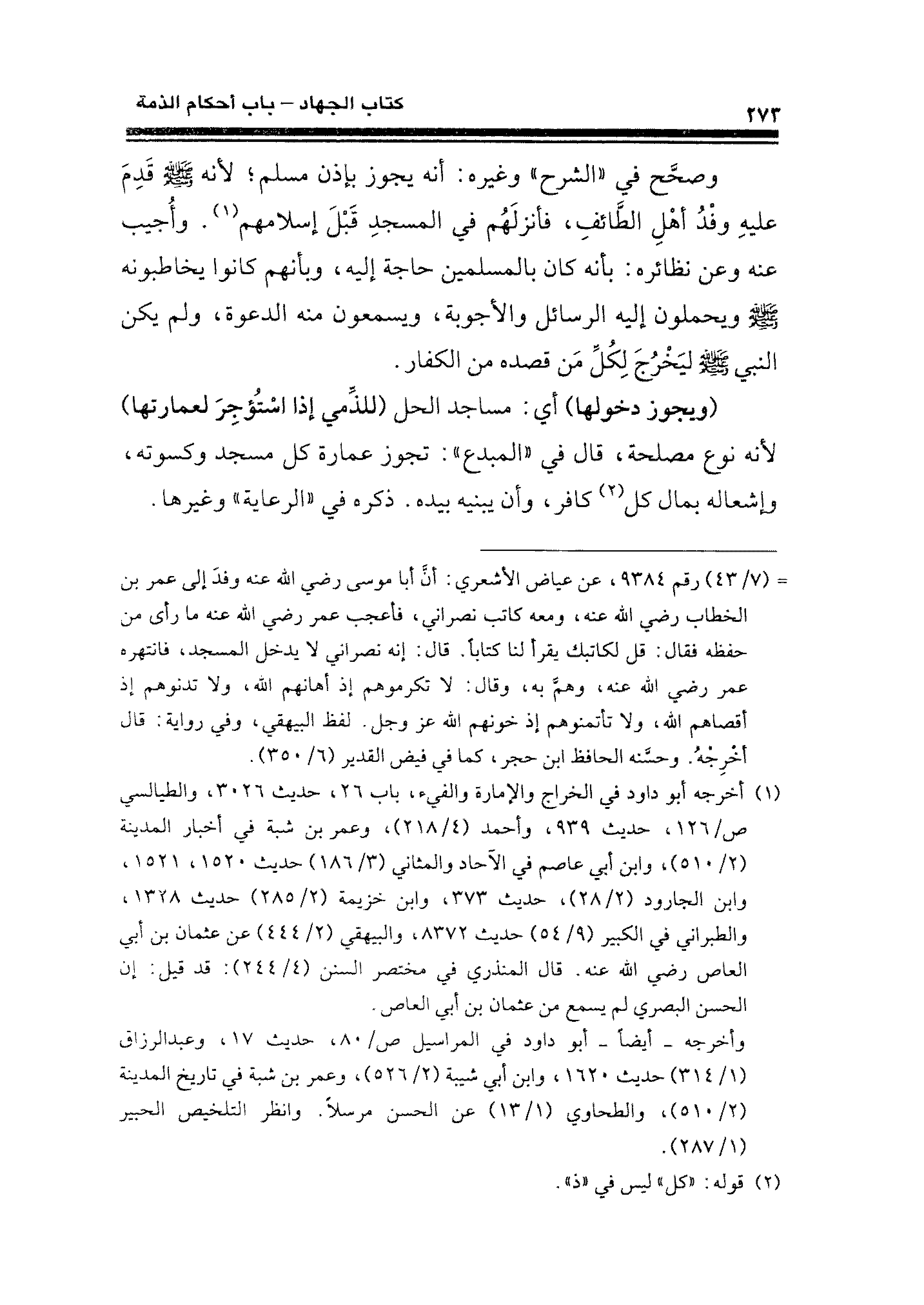 = (٧/ ٤٣) رقم ٩٣٨٤، عن عياض الأشعري: أنَّ أبا موسى رضي الله عنه وفدَ إلى عمر بن الخطاب رضي الله عنه، ومعه كاتب نصراني، فأعجب عمر رضي الله عنه ما رأى من حفظه فقال: قل لكاتبك يقرأ لنا كتابًا. قال: إنه نصراني لا يدخل المسجد، فانتهره عمر رضي الله عنه، وهمَّ به، وقال: لا تكرموهم إذ أهانهم الله، ولا تدنوهم إذ أقصاهم الله، ولا تأمنوهم إذ خونهم الله عزَّ وجلَّ. لفظ البيهقي: وفي رواية: قال أخْرِجْهُ. وحسَّنه الحافظ ابن حجر، كما في فيض القدير (٦/ ٣٥٠).