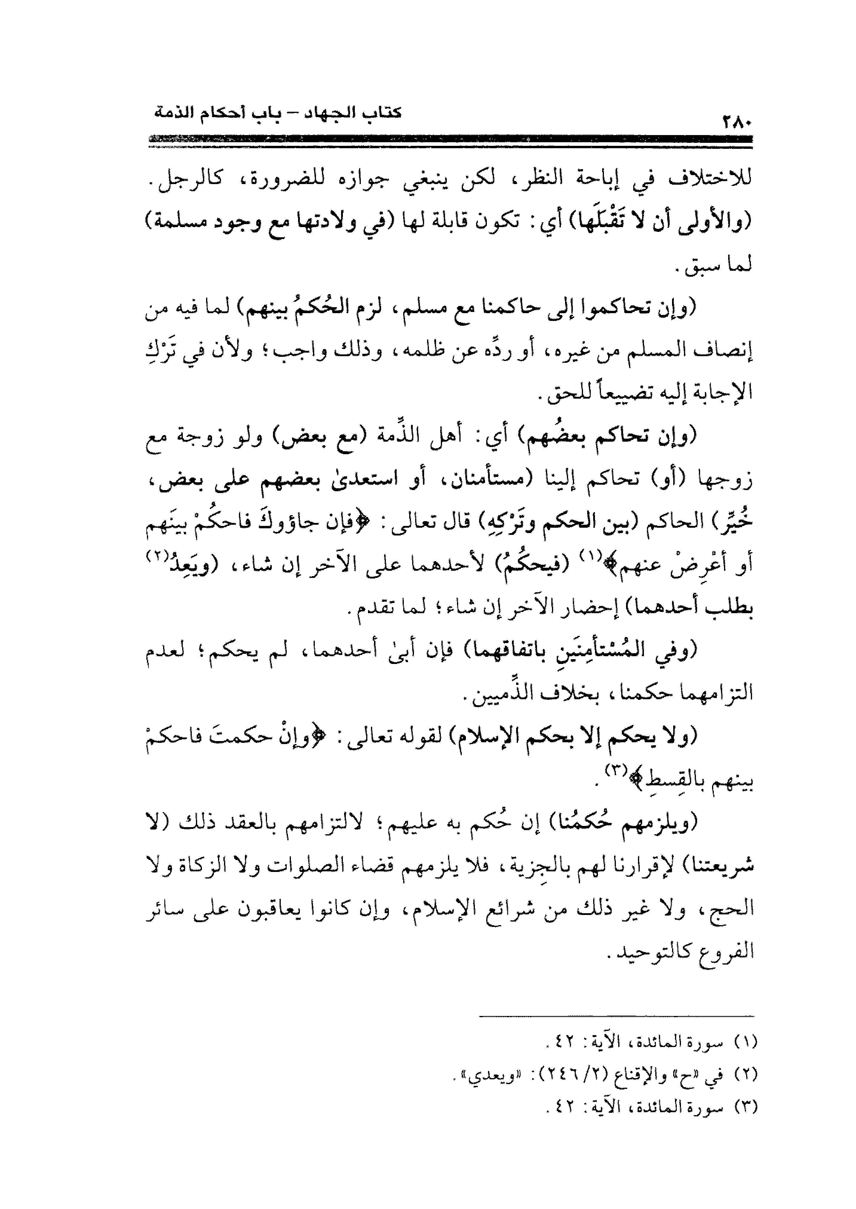 (ولا يحكم إلا بحكم الإسلام) لقوله تعالى: {وَإِنْ حَكَمْتَ فَاحْكُمْ بَينَهُمْ بِالْقِسْطِ} (¬٣).