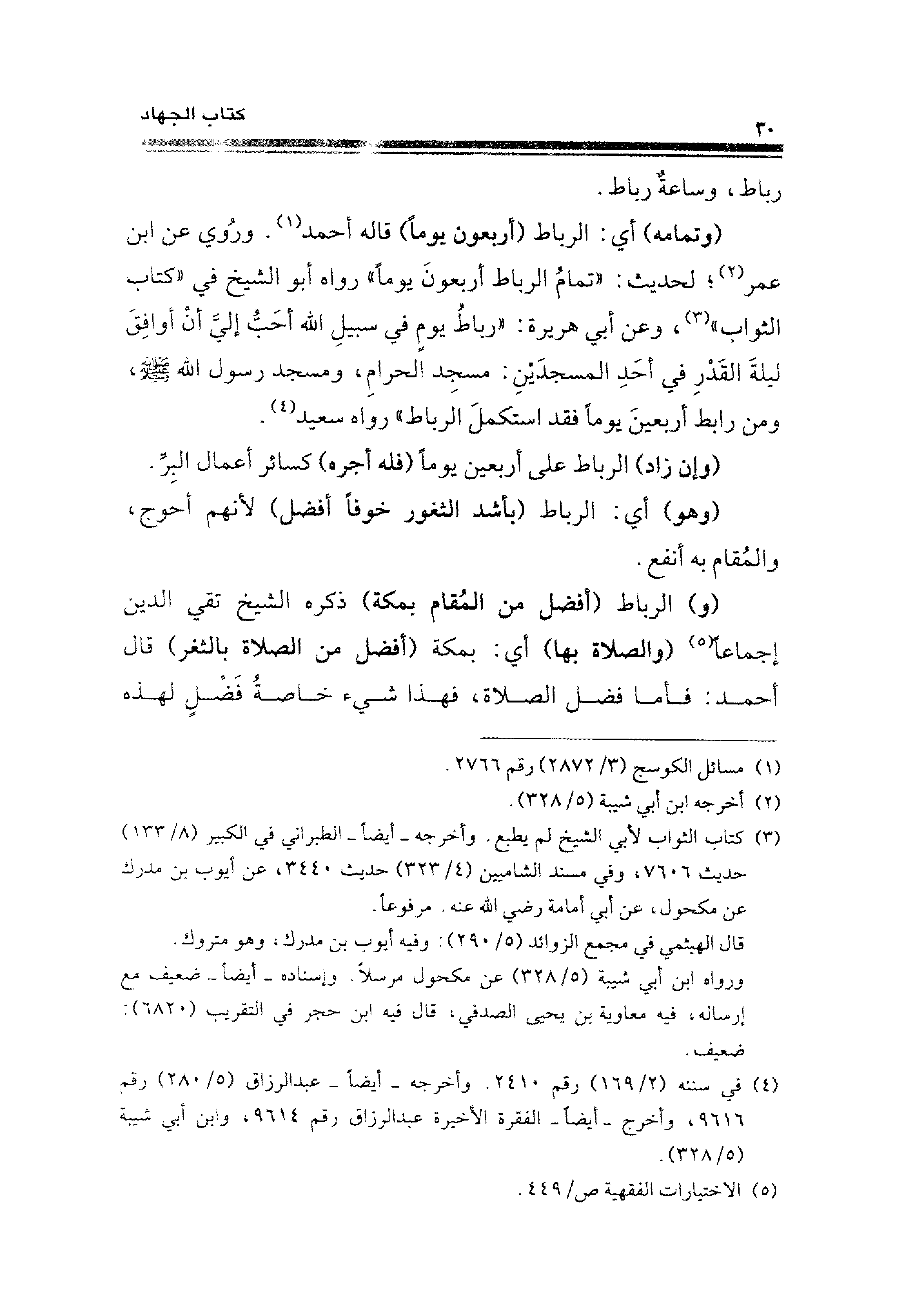 (وتمامه) أي: الرباط (أربعون يومًا) قاله أحمد (¬١). ورُوي عن ابن عمر (¬٢)؛ لحديث: "تمامُ الرباط أربعونَ يومًا" رواه أبو الشيخ في "كتاب الثواب" (¬٣)، وعن أبي هريرة: "رباطُ يومِ في سبيلِ الله أحَبُّ إليَّ أنْ أوافِقَ ليلةَ القَدْرِ في أحَدِ المسجدَيْنِ: مسجِد الحرامِ، ومسجد رسول الله - صلى الله عليه وسلم -، ومن رابط أربعينَ يومًا فقد استكملَ الرباط" رواه سعيد (¬٤).