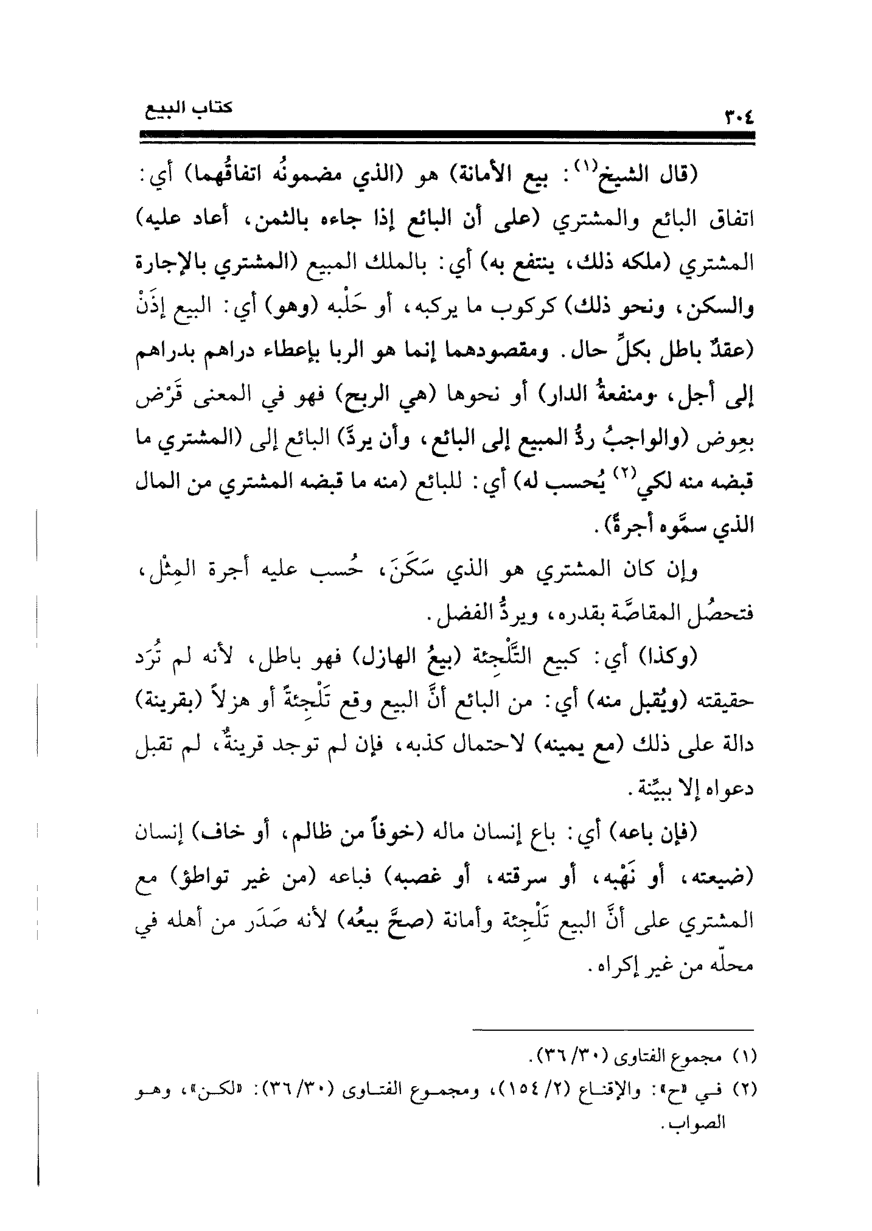 (قال الشيخ (¬١): بيع الأمانة) هو (الذي مضمونُه اتفاقُهما) أي: اتفاق البائع والمشتري (على أن البائع إذا جاءه بالثمن، أعاد عليه) المشتري (ملكه ذلك، ينتفع به) أي: بالملك المبيع (المشتري بالإجارة والسكن، ونحو ذلك) كركوب ما يركبه، أو حَلْبه (وهو) أي: البيع إذَنْ (عقدٌ باطل بكلِّ حال. ومقصودهما إنما هو الربا بإعطاء دراهم بدراهم إلى أجل، ومنفعةُ الدار) أو نحوها (هي الربح) فهو في المعنى قَرْض بعِوض (والواجبُ ردُّ المبيع إلى البائع، وأن يردَّ) البائع إلى (المشتري ما قبضه منه لكي (¬٢) يُحسب له) أي: للبائع (منه ما قبضه المشتري من المال الذي سمَّوه أجرةً).