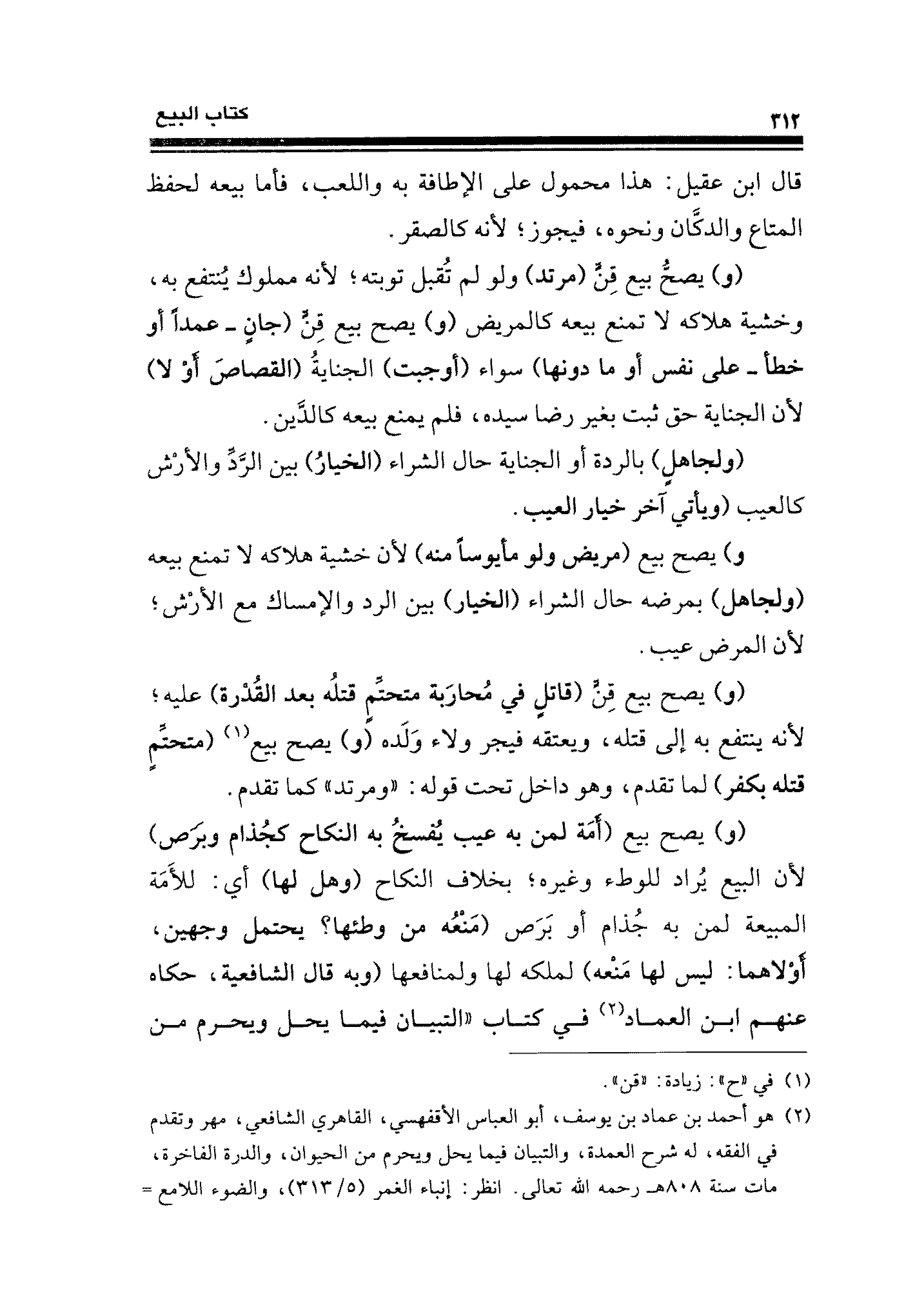 (و) يصح بيع (أَمَة لمن به عيب يُفسخُ به النكاح كجُذام وبَرَص) لأن البيع يُراد للوطء وغيره؛ بخلاف النكاح (وهل لها) أي: للأَمَة المبيعة لمن به جُذام أو بَرَص (مَنْعُه من وطئها؟ يحتمل وجهين، أَوْلاهما: ليس لها مَنْعه) لملكه لها ولمنافعها (وبه قال الشافعية، حكاه عنهم ابن العماد (¬٢) في كتاب "التبيان فيما يحل ويحرم من