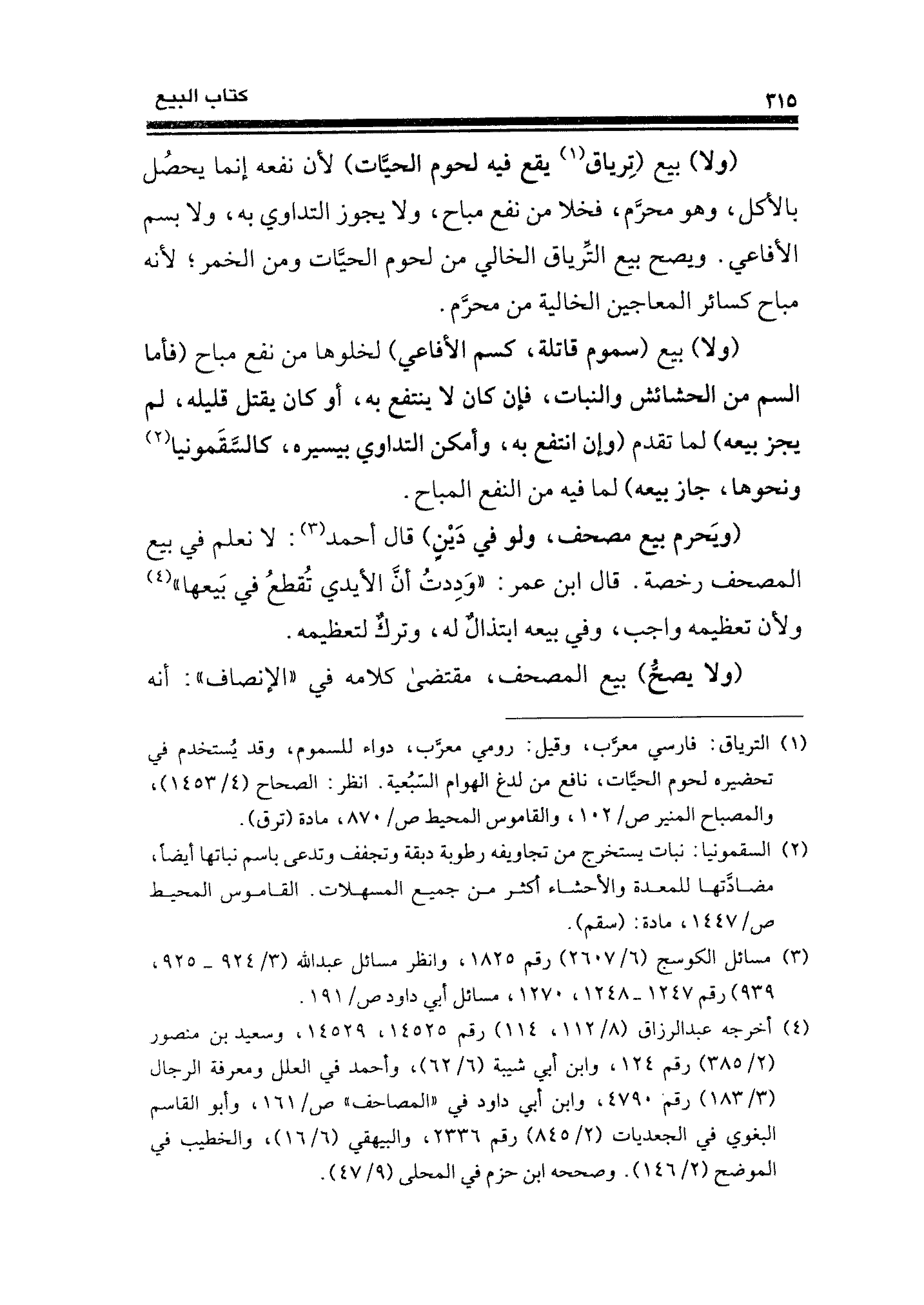 (ولا) بيع (تِرياق (¬١) يقع فيه لحوم الحيَّات) لأن نفعه إنما يحصُل بالأكل، وهو محرَّم، فخلا من نفع مباح، ولا يجوز التداوي به، ولا بسم الأفاعي. ويصح بيع التِّرياق الخالي من لحوم الحيَّات ومن الخمر؛ لأنه مباح كسائر المعاجِين الخالية من محرَّم.