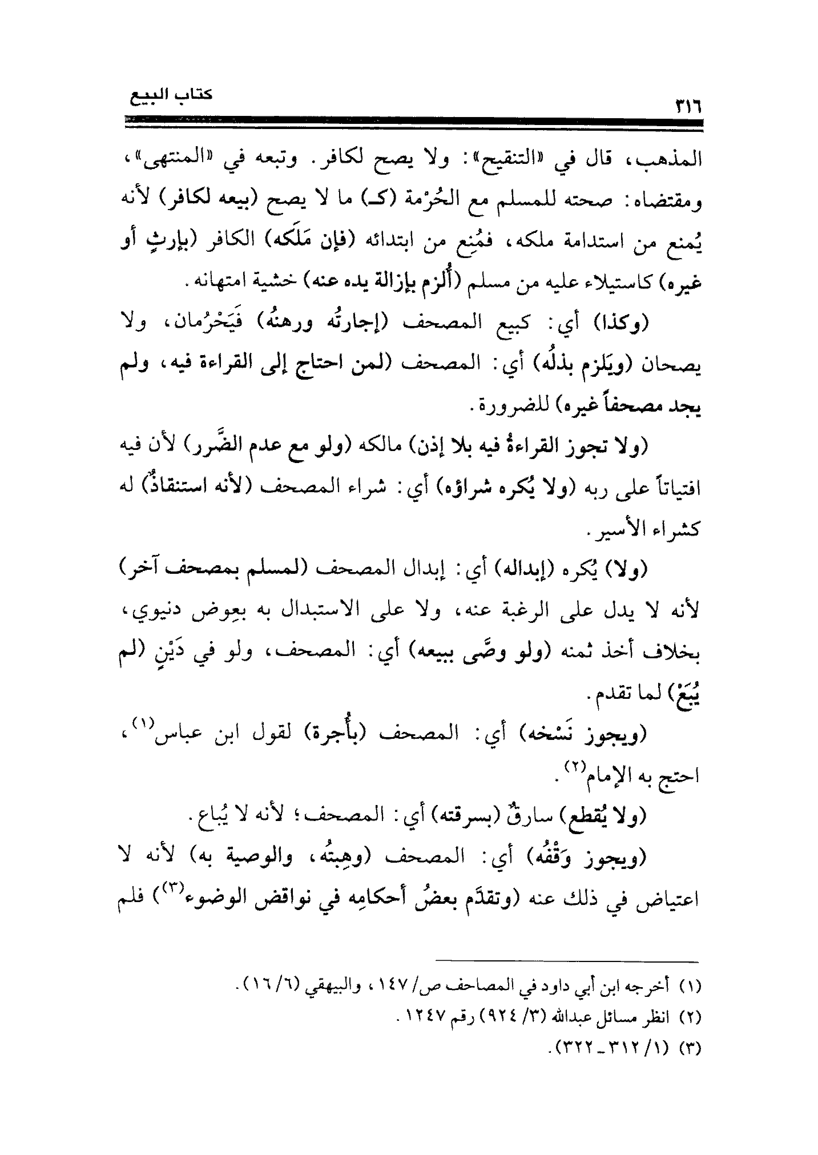 (ولا) يُكره (إبداله) أي: إبدال المصحف (لمسلم بمصحف آخر) لأنه لا يدل على الرغبة عنه، ولا على الاستبدال به بعِوض دنيوي، بخلاف أخذ ثمنه (ولو وصَّى ببيعه) أي: المصحف، ولو في دَينٍ (لم يُبَعْ) لما تقدم.