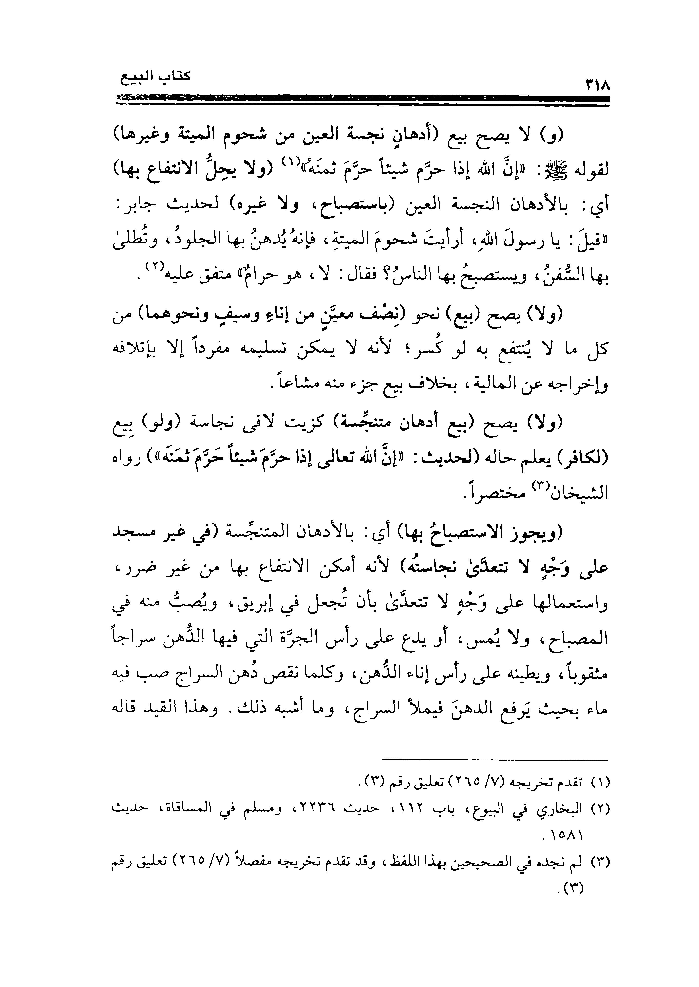 (ولا) يصح (بيع أدهان متنجِّسة) كزيت لاقى نجاسة (ولو) بِيع (لكافر) يعلم حاله (لحديث: "إنَّ الله تعالى إذا حرَّمَ شيئًا. حَرَّمَ ثمَنَه") رواه الشيخان (¬٣) مختصرًا.