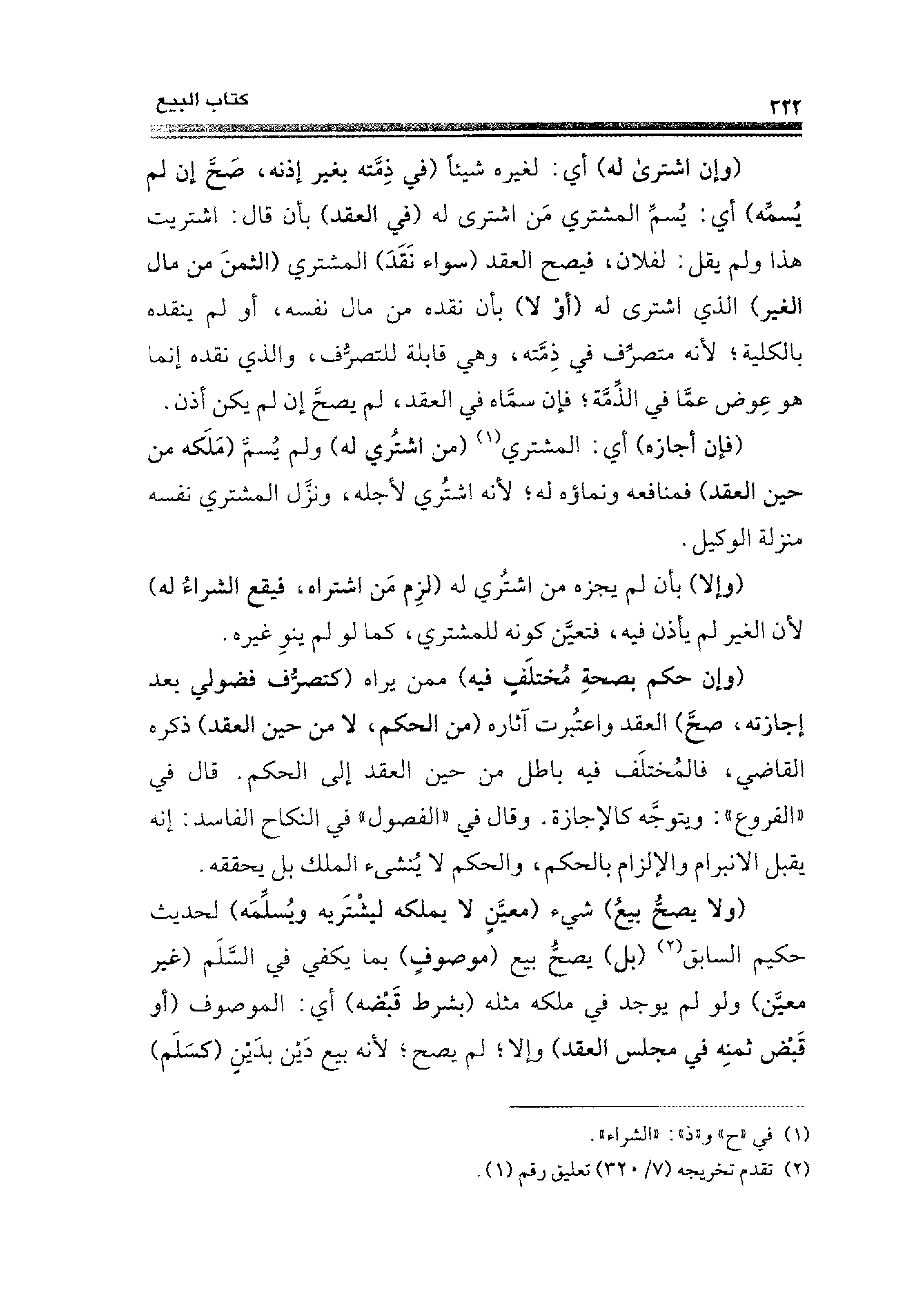(وإن اشترى له) أي: لغيره شيئًا (في ذِمَّته بغير إذنه، صَحُّ إن لم يُسمِّه) أي: يُسمِّ المشتري مَن اشترى له (في العقد) بأن قال: اشتريت هذا ولم يقل: لفلان، فيصح العقد (سواء نَقَدَ) المشتري (الثمنَ من مال الغير) الذي اشترى له (أوْ لا) بأن نقده من مال نفسه، أو لم ينقده بالكلية؛ لأنه متصرِّف في ذِمَّته، وهي قابلة للتصرُّف، والذي نقده إنما هو عِوض عمَّا في الذِّمَّة؛ فإن سمَّاه في العقد، لم يصحَّ إن لم يكن أذن.