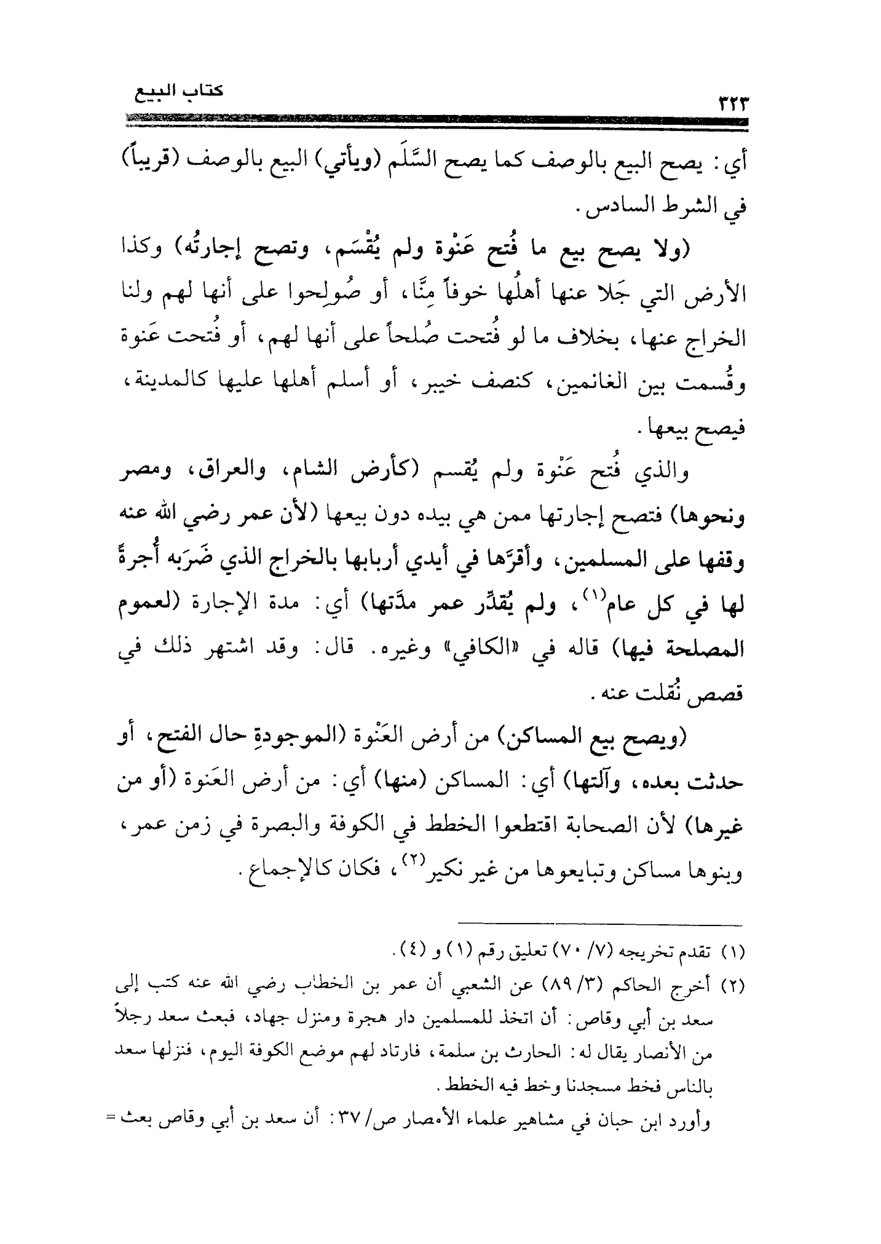 (ولا يصح بيع ما فُتح عَنْوة ولم يُقْسَم، وتصح إجارتُه) وكذا الأرض التي جَلا عنها أهلُها خوفًا مِنَّا، أو صُولِحوا على أنها لهم ولنا الخراج عنها، بخلاف ما لو فُتحت صُلحًا على أنها لهم، أو فُتحت عَنوة وقُسمت بين الغانمين، كنصف خيبر، أو أسلم أهلها عليها كالمدينة، فيصح بيعها.