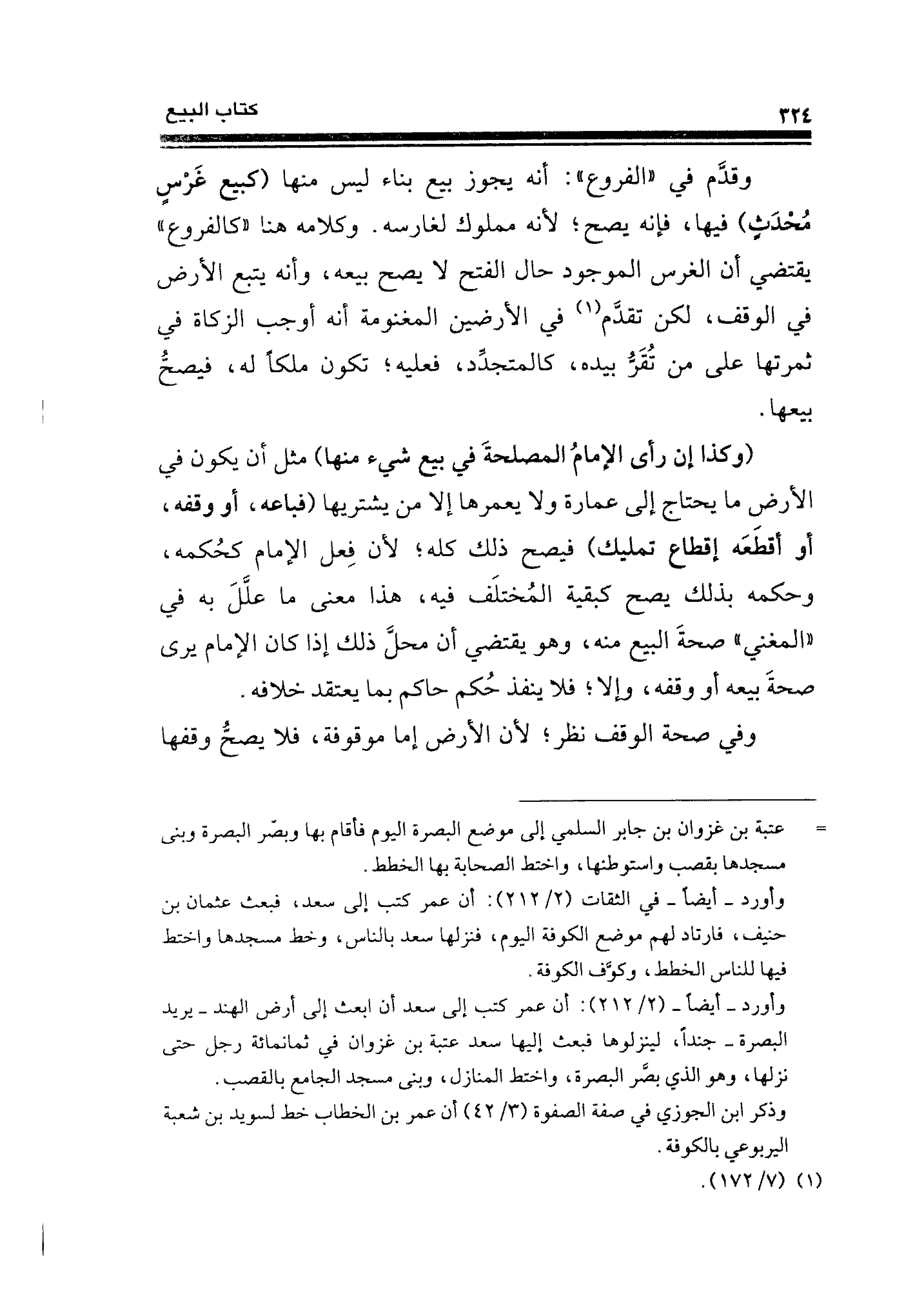 وقدَّم في "الفروع": أنه يجوز بيع بناء ليس منها (كبيع غَرْسِ مُحْدَثٍ) فيها، فإنه يصح؛ لأنه مملوك لغارسه. وكلامه هنا "كالفروع" يقتضي أن الغرس الموجود حال الفتح لا يصح بيعه، وأنه يتبع الأرض في الوقف، لكن تقدَّم (¬١) في الأرضين المغنومة أنه أوجب الزكاة في ثمرتها على من تُقَرُّ بيده، كالمتجدِّد، فعليه؛ تكون ملكًا له، فيصحُّ بيعها.