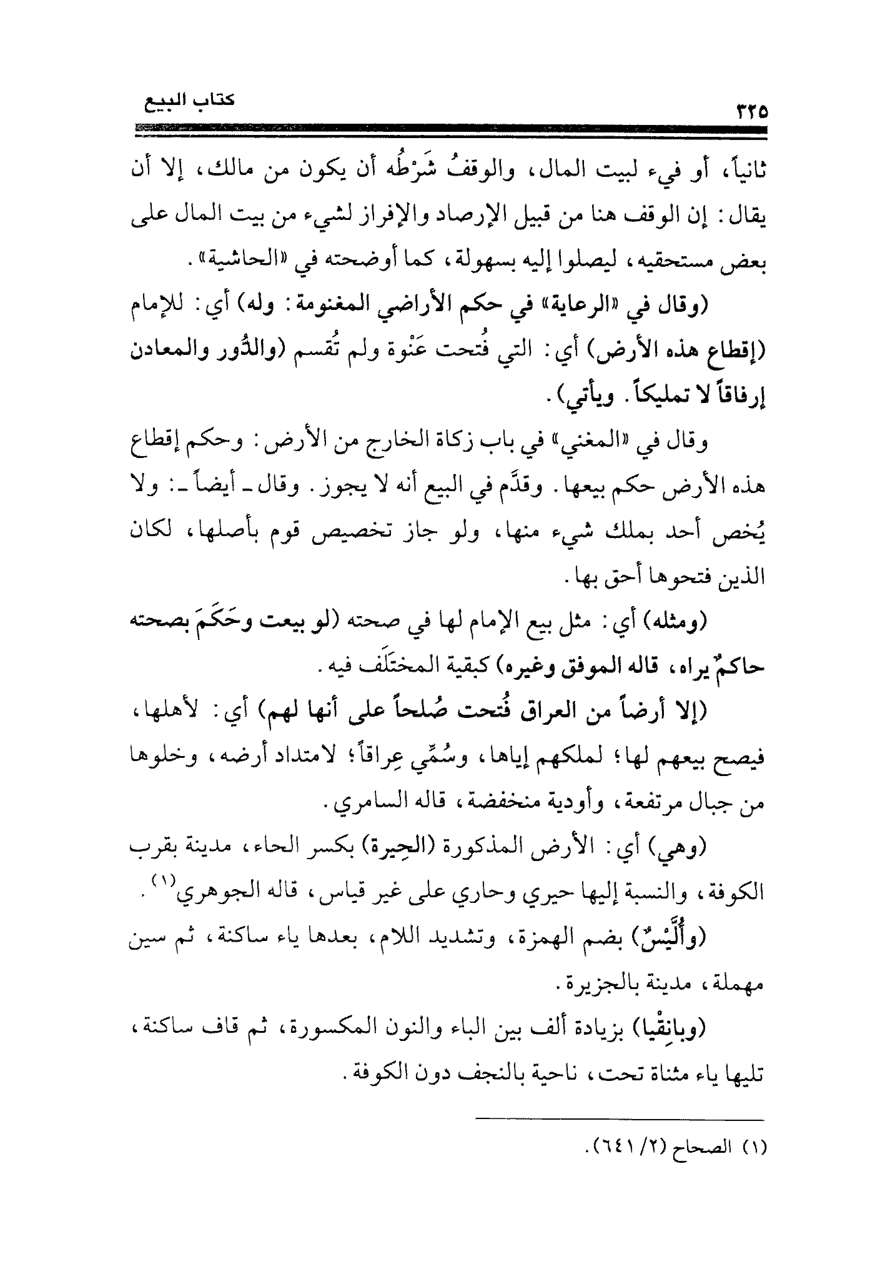(إلا أرضًا من العراق فُتحت صُلحًا على أنها لهم) أي: لأهلها، فيصح بيعهم لها؛ لملكهم إياها، وسُمِّي عِراقًا؛ لامتداد أرضه، وخلوها من جبال مرتفعة، وأودية منخفضة، قاله السامري.