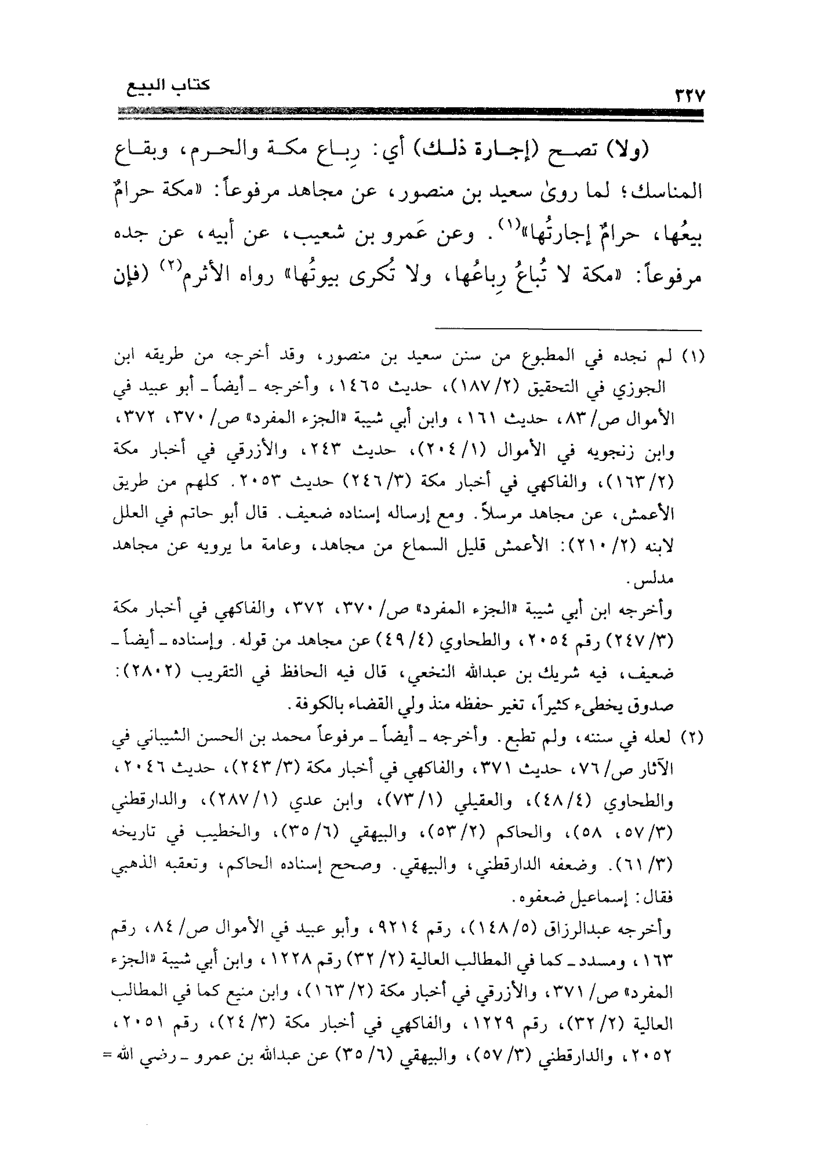 (¬١) لم نجده في المطبوع من سنن سعيد بن منصور، وقد أخرجه من طريقه ابن الجوزي في التحقيق (٢/ ١٨٧)، حديث ١٤٦٥، وأخرجه -أيضًا- أبو عبيد في الأموال ص / ٨٣، حديث ١٦١، وابن أبي شيبة "الجزء المفرد" ص / ٣٧٠، ٣٧٢، وابن زنجويه في الأموال (١/ ٢٠٤)، حديث ٢٤٣، والأزرقي في أخبار مكة (٢/ ١٦٣)، والفاكهي في أخبار مكة (٣/ ٢٤٦) حديث ٢٠٥٣. كلهم من طريق الأعمش، عن مجاهد مرسلًا. ومع إرساله إسناده ضعيف. قال أبو حاتم في العلل لابنه (٢/ ٢١٠): الأعمش قليل السماع من مجاهد، وعامة ما يرويه عن مجاهد مدلس.