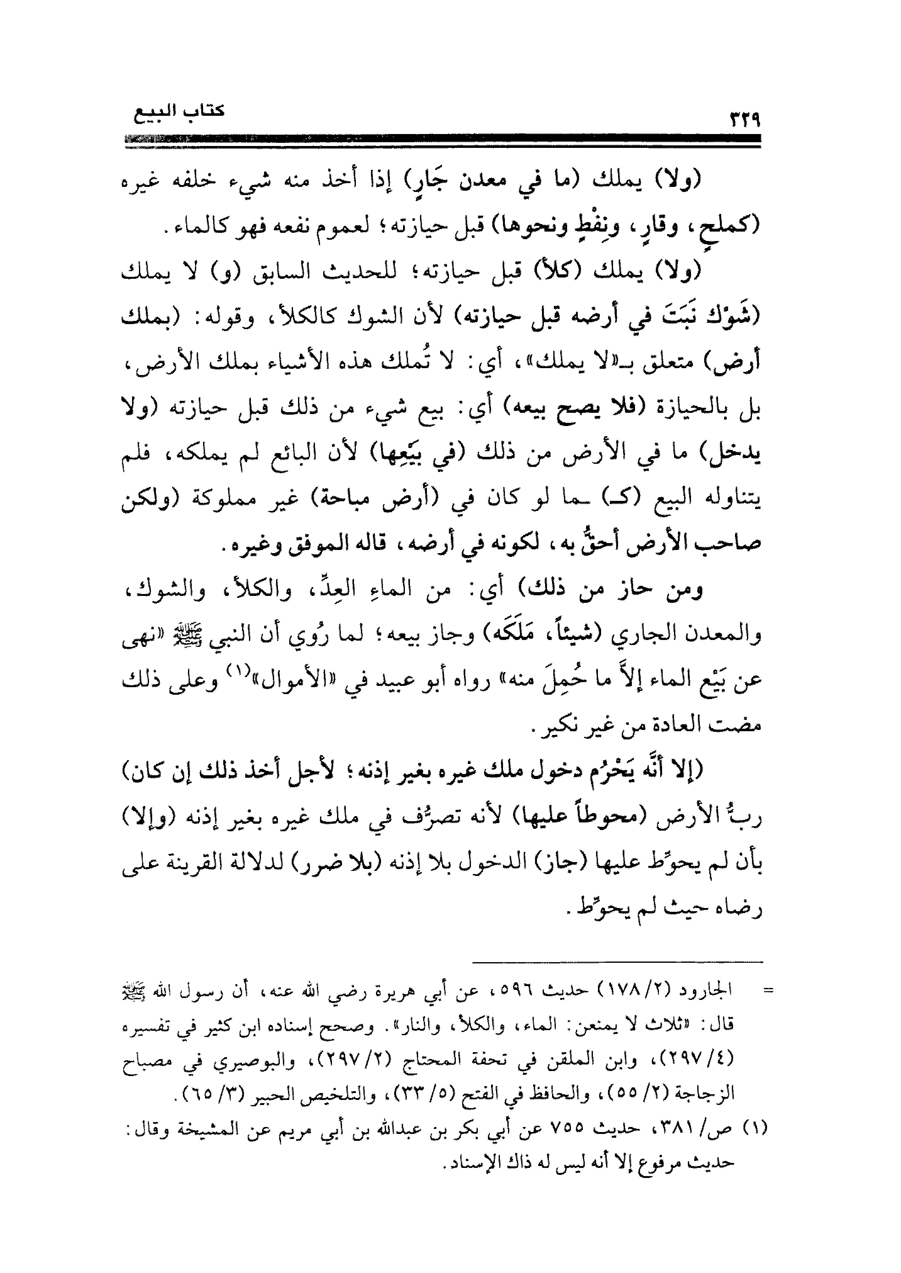 = الجارود (٢/ ١٧٨) حديث ٥٩٦، عن أبي هريرة رضي الله عنه، أن رسول الله - صلى الله عليه وسلم - قال: "ثلاث لا يمنعن: الماء، والكلأ، والنار". وصحح إسناده ابن كثير في تفسيره (٤/ ٢٩٧)، وابن الملقن في تحفة المحتاج (٢/ ٢٩٧)، والبوصيري في مصباح الزجاجة (٣/ ٥٥)، والحافظ في الفتح (٥/ ٣٣)، والتلخيص الحبير (٣/ ٦٥).