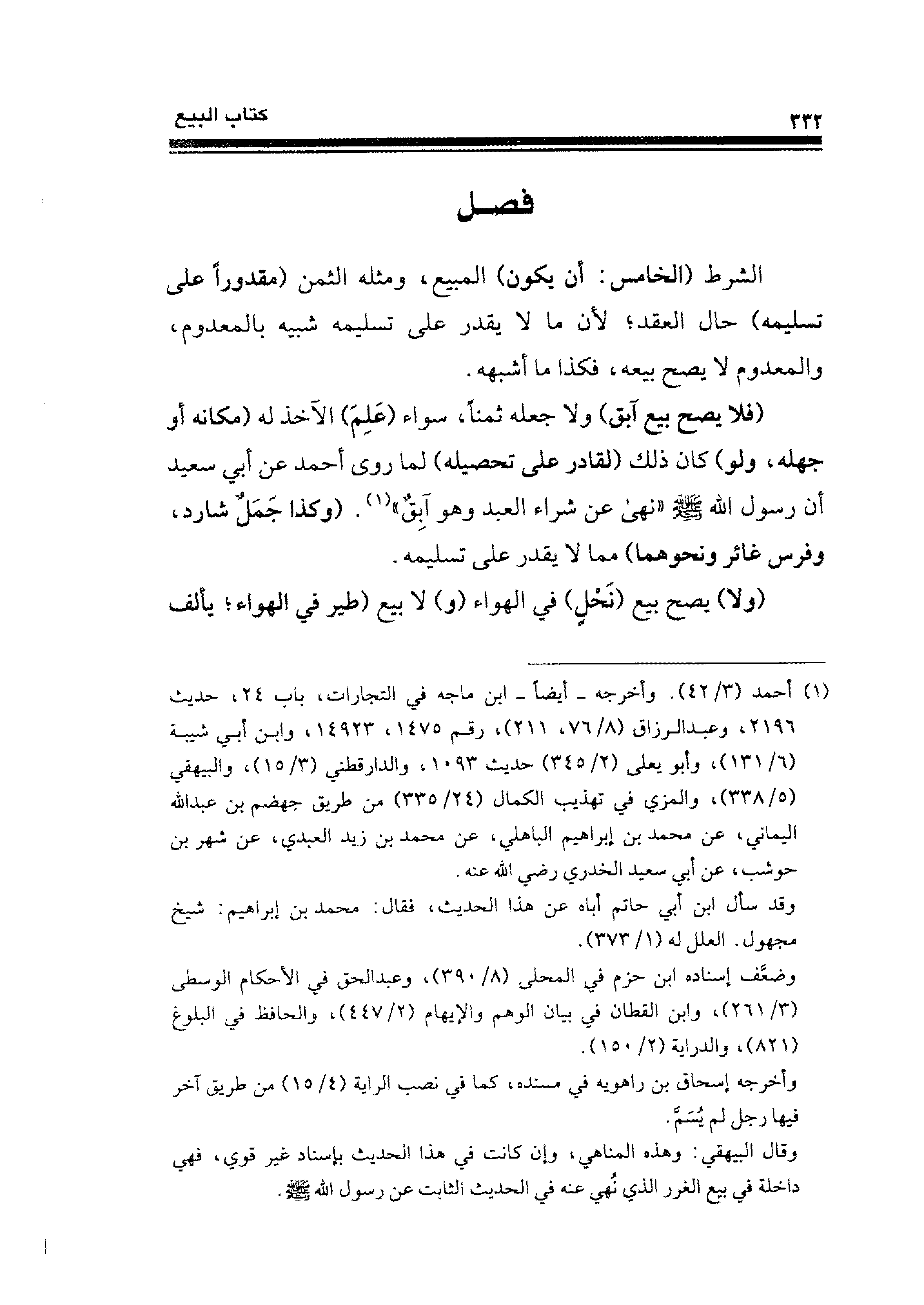 (فلا يصح بيع آبق) ولا جعله ثمنًا، سواء (عَلِمَ) الآخذ له (مكانه أو جهله، ولو) كان ذلك (لقادر على تحصيله) لما روى أحمد عن أبي سعيد أن رسول الله - صلى الله عليه وسلم - "نهى عن شراء العبد وهو آبِقٌ" (¬١). (وكذا جَمَلٌ شارد، وفرس غائر ونحوهما) مما لا يقدر على تسليمه.