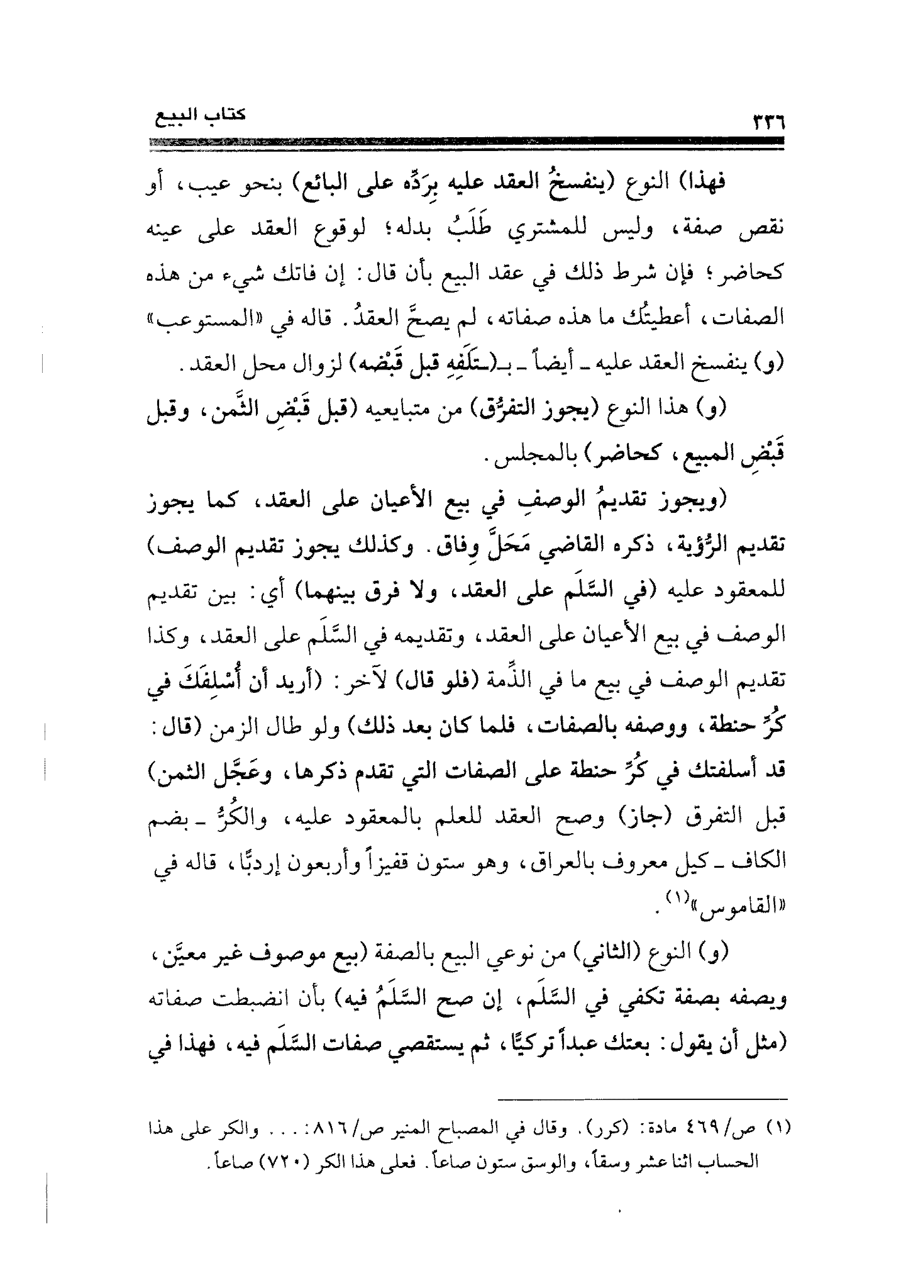 (ويجوز تقديمُ الوصفِ في بيع الأعيان على العقد، كما يجوز تقديم الرُّؤية، ذكره القاضي مَحَلَّ وفاق. وكذلك يجوز تقديم الوصف) للمعقود عليه (في السَّلَم على العقد، ولا فرق بينهما) أي: بين تقديم الوصف في بيع الأعيان على العقد، وتقديمه في السَّلَم على العقد، وكذا تقديم الوصف في بيع ما في الذِّمة (فلو قال) لآخر: (أريد أن أُسْلِفَكَ في كُرِّ حنطة، ووصفه بالصفات، فلما كان بعد ذلك) ولو طال الزمن (قال: قد أسلفتك في كُرِّ حنطة على الصفات التي تقدم ذكرها، وعَجَّل الثمن) قبل التفرق (جاز) وصح العقد للعلم بالمعقود عليه، والكُرُّ -بضم الكاف- كيل معروف بالعراق، وهو ستون قفيزًا وأربعون إردبًّا، قاله في "القاموس" (¬١).
