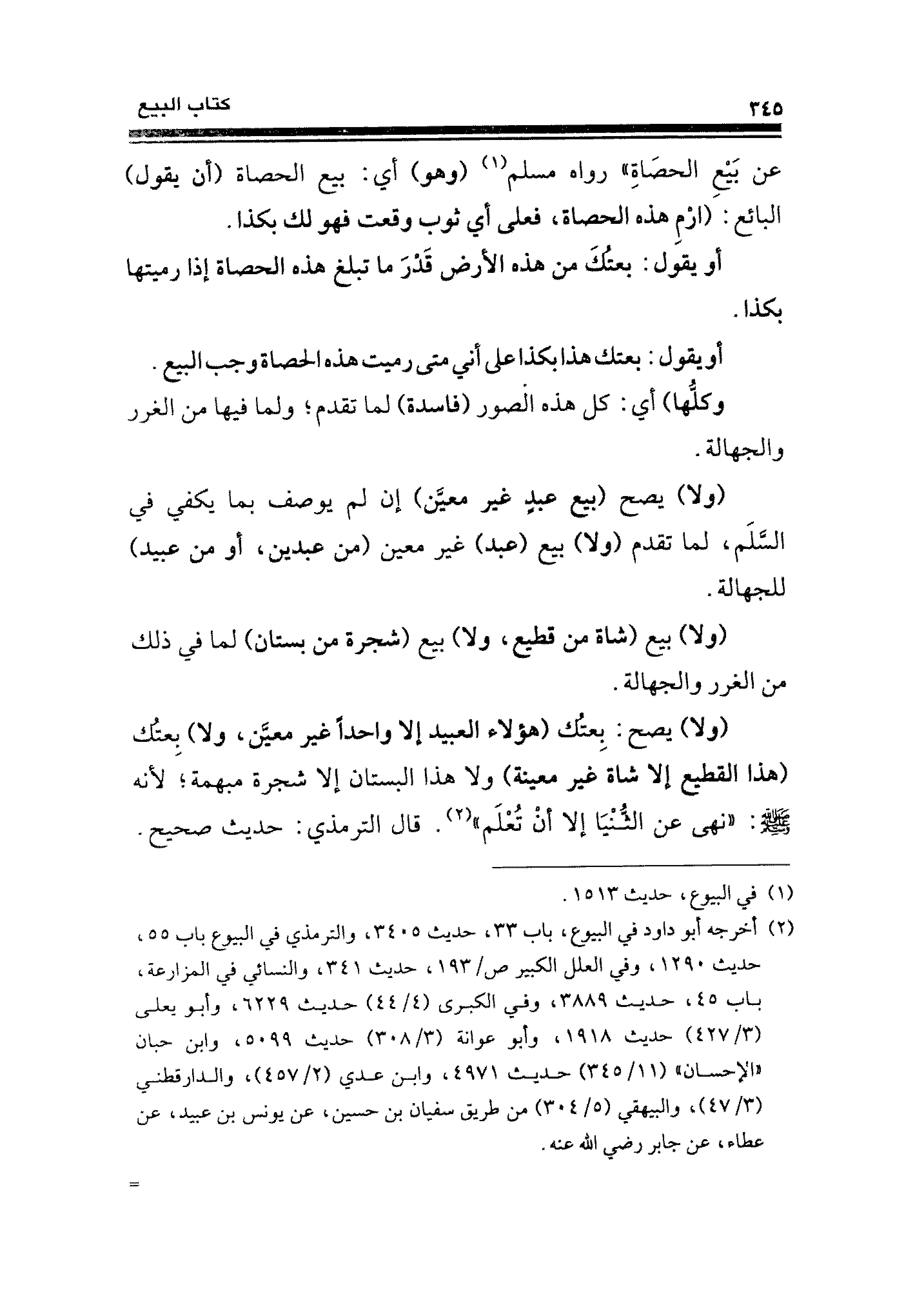 (ولا) يصح: بِعتُك (هؤلاء العبيد إلا واحدًا غير معيَّن، ولا) بعتُك (هذا القطيع إلا شاة غير معينة) ولا هذا البستان إلا شجرة مبهمة؛ لأنه - صلى الله عليه وسلم -: "نهى عن الثُّنْيَا إلا أنْ تُعْلَم" (¬٢). قال الترمذي: حديث صحيح.