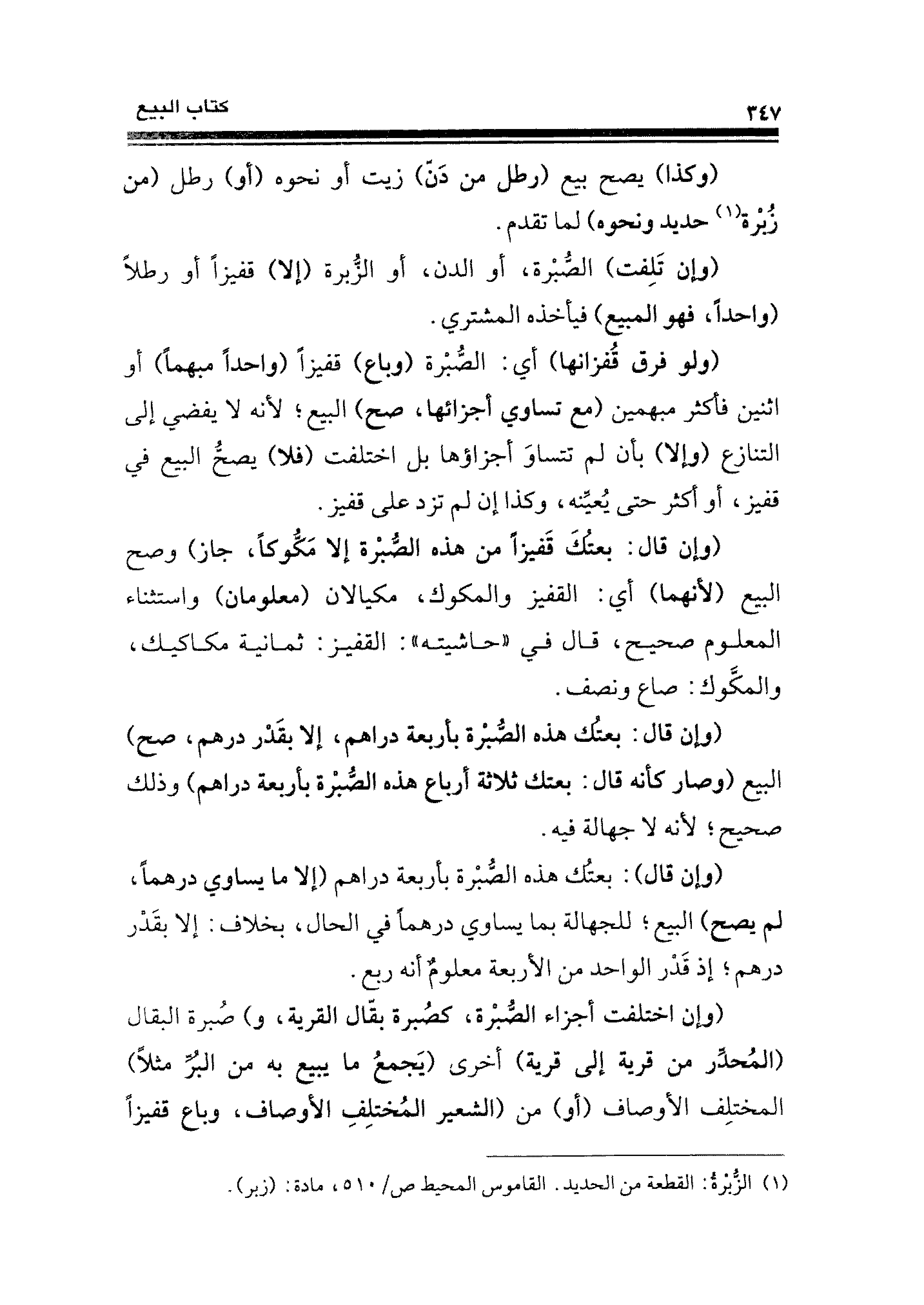 (وإن اختلفت أجزاء الصُّبْرة، كصُبرة بقّال القرية، و) صُبرة البقال (المُحدِّر من قرية إلى قرية) أخرى (يَجمعُ ما يبيع به من البُرِّ مثلًا) المختلِف الأوصاف (أو) من (الشعير المُختلِفِ الأوصاف، وباع قفيزًا