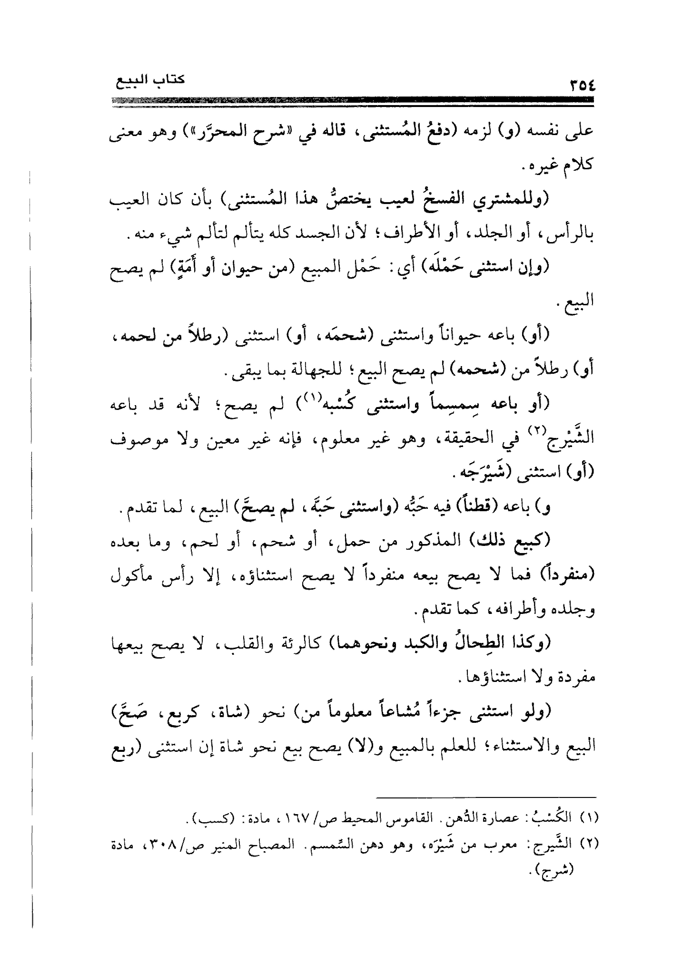 (أو) باعه حيوانًا واستثنى (شحمَه، أو) استثنى (رطلًا من لحمه، أو) رطلا من (شحمه) لم يصح البيع؛ للجهالة بما يبقى.
